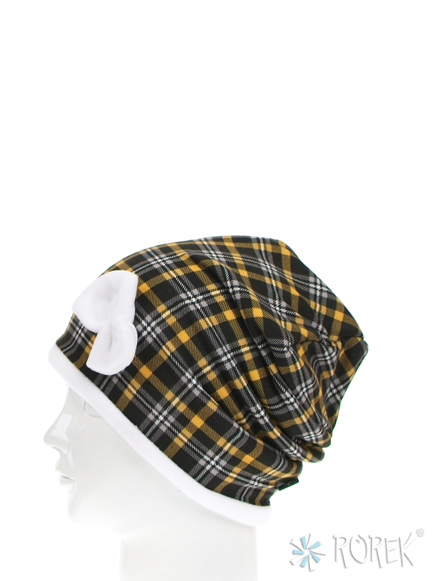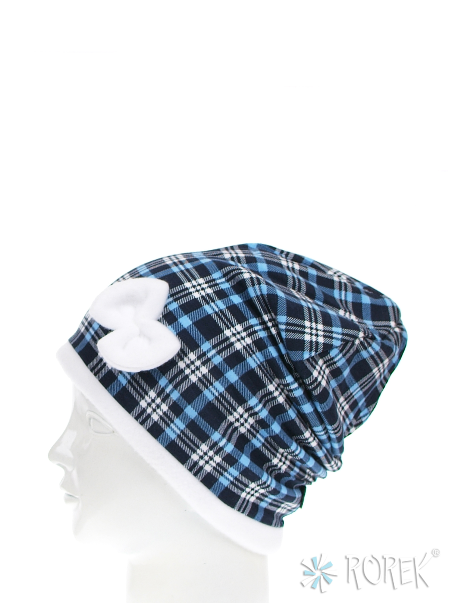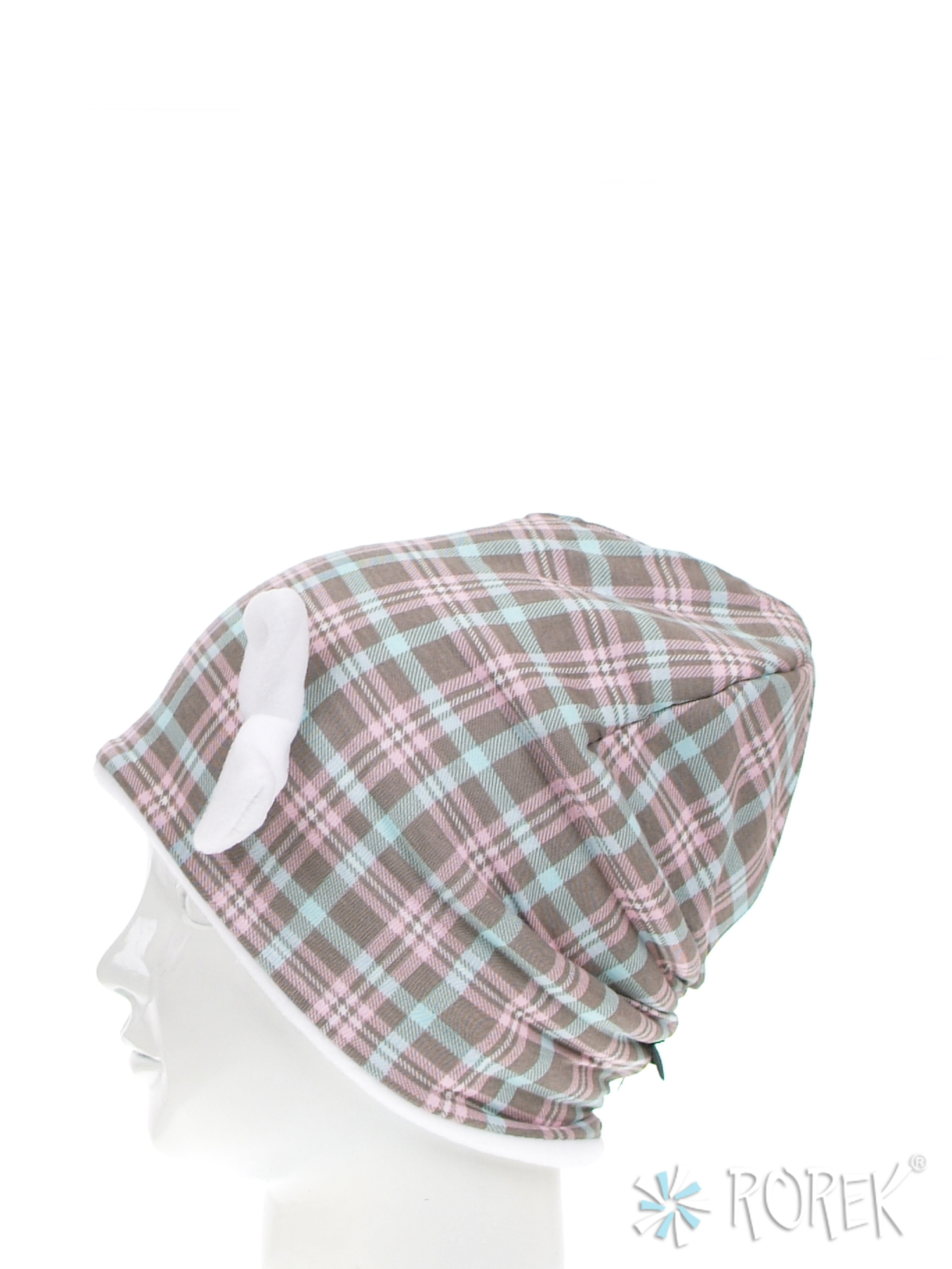 Czapka dziecięca krasnal wykonana z miłego w dotyku materiału w kratkę, podszyta ciepłym polarem.