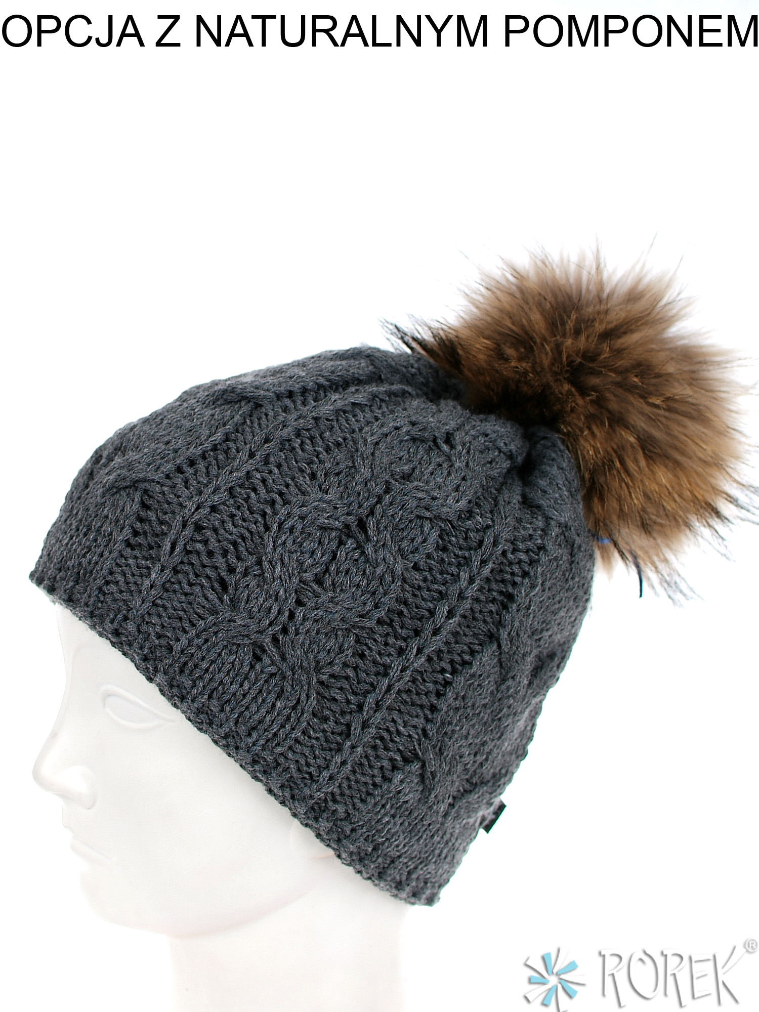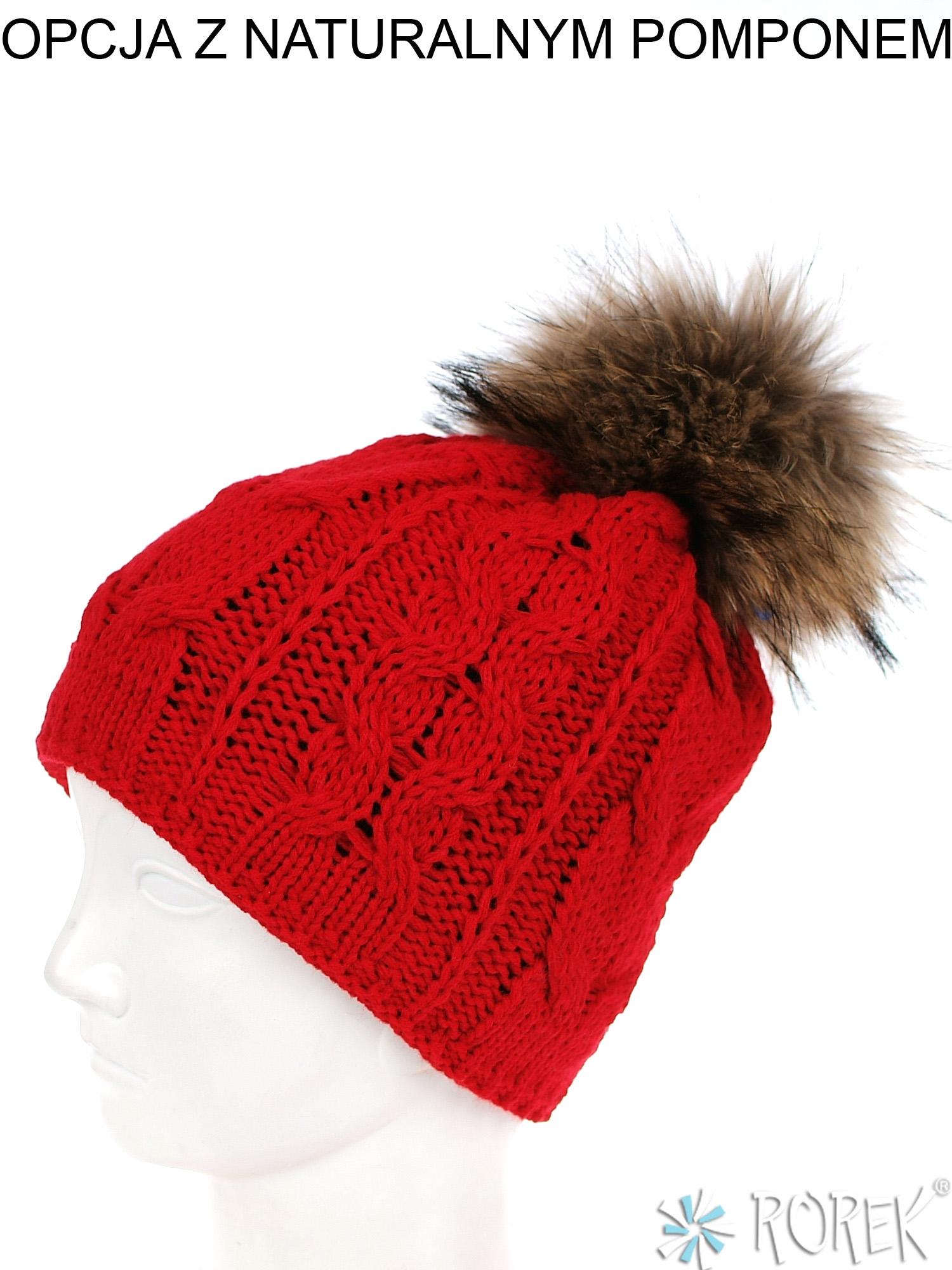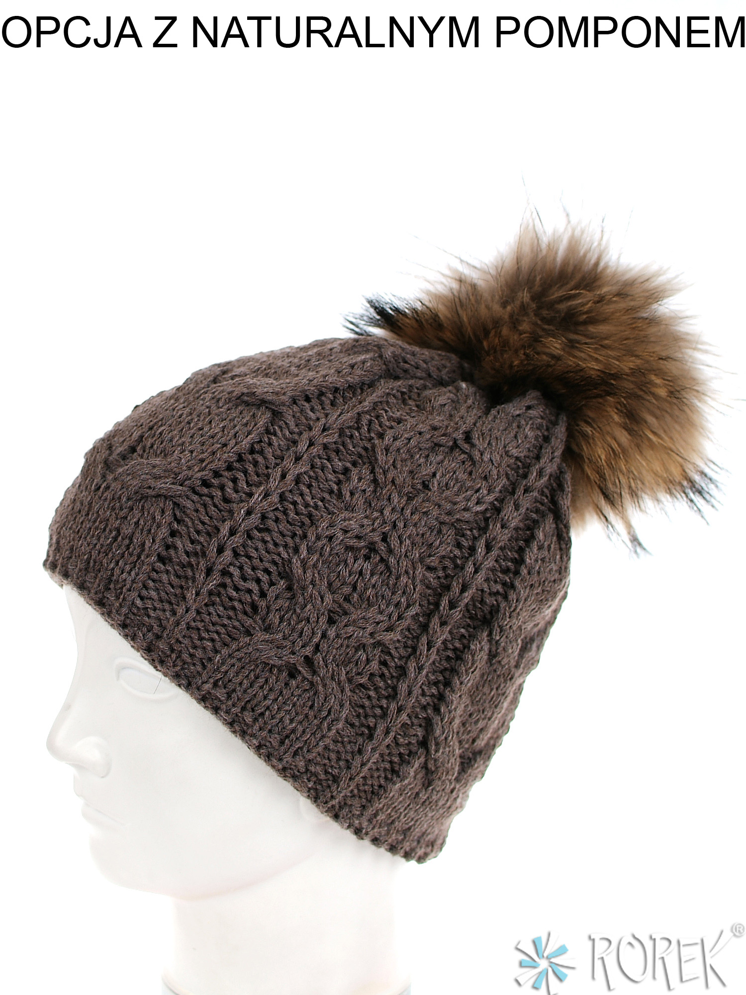 Czapka zimowa damska, o splocie grubego warkocza, który idealnie pasuje do komina ID: 3305. Środek czapki w całości podszyty polarem, możliwość ozdobienia czapki pomponem z jenota lub z ekologicznego futerka.