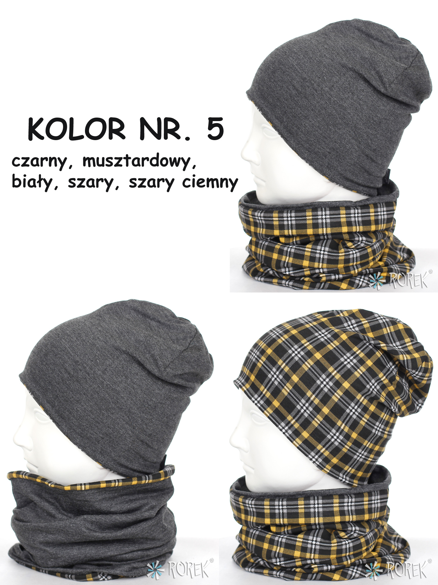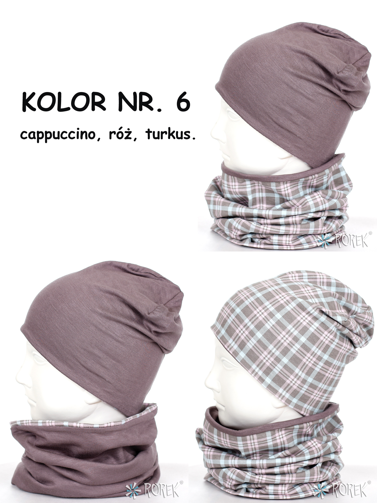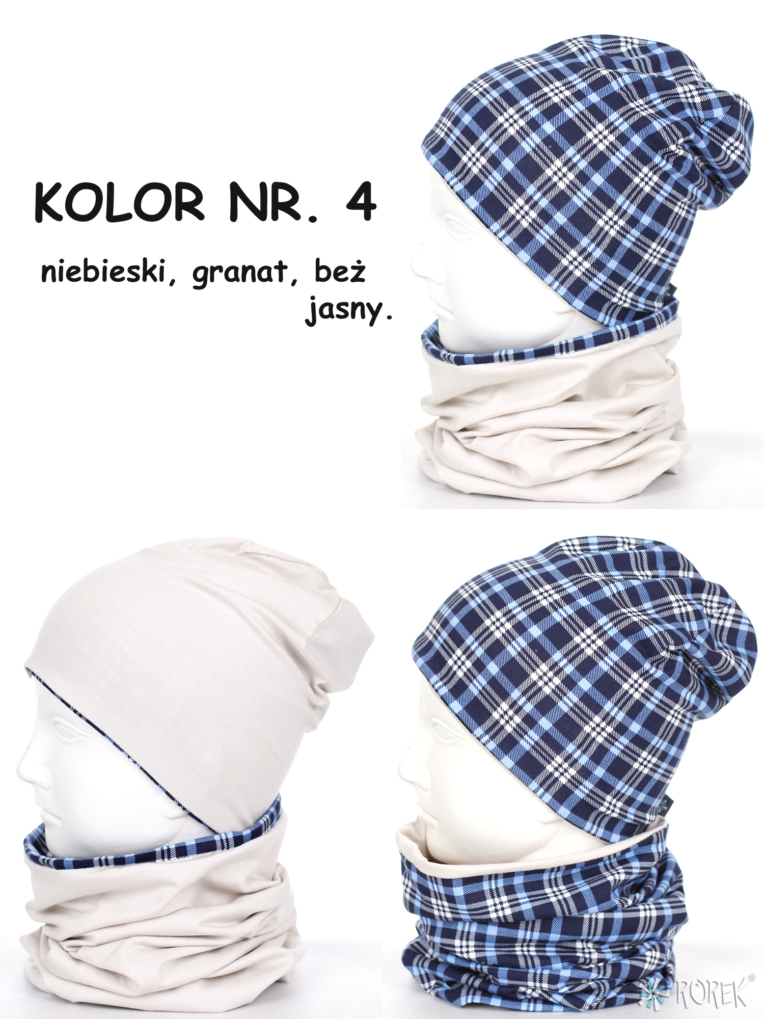 Komplet dziecięcy czapka krasnal + komin , dwustronny, dzięki czemu można go nosić na 4 różne sposoby. Komplecik wykonany z bardzo miłego i delikatnego w dotyku materiału bawełnianego, idealnego na wiosenno - jesienne dni. Czapka z kominem dostępna jest w różnych kombinacjach kolorystycznych.