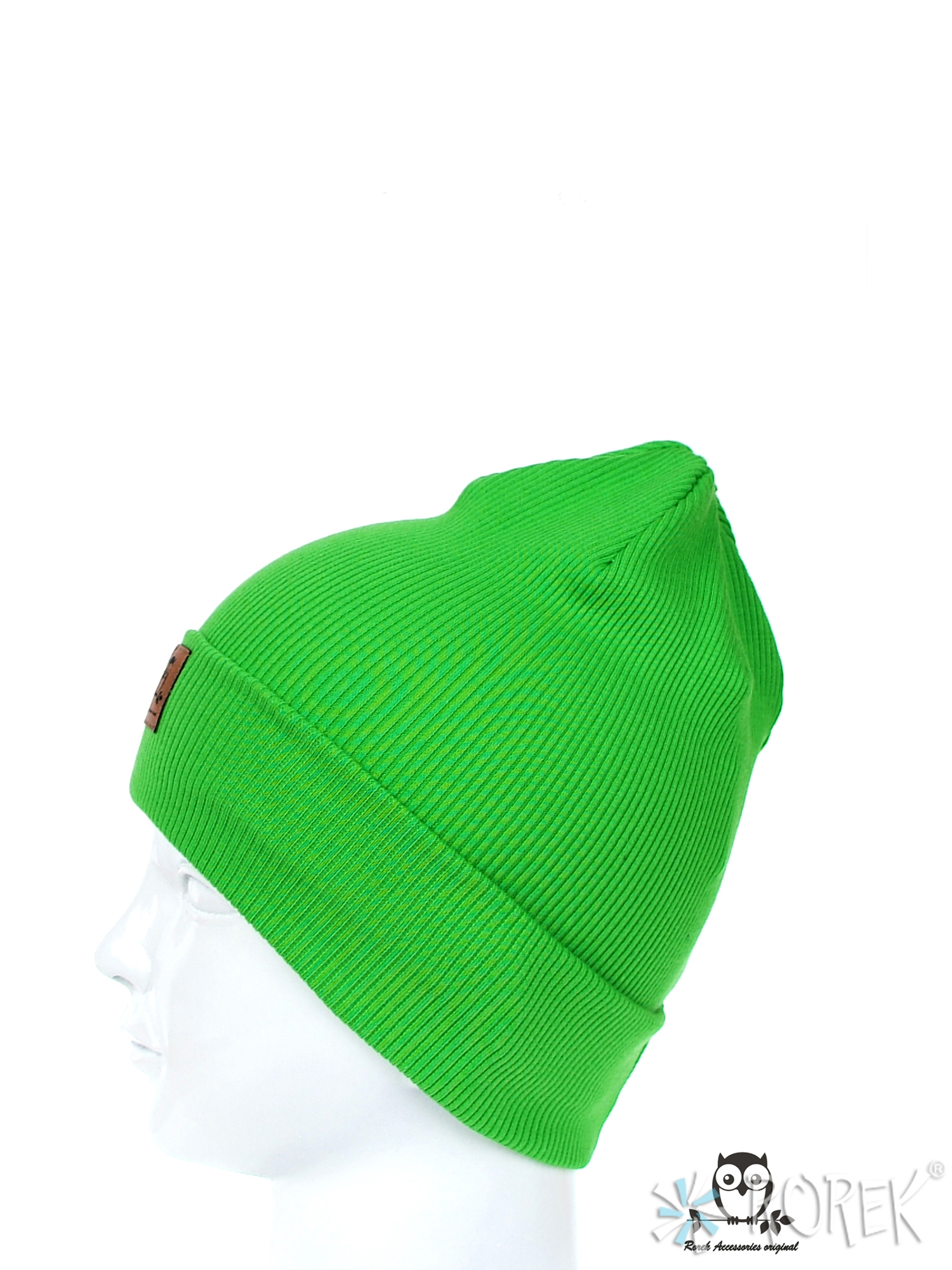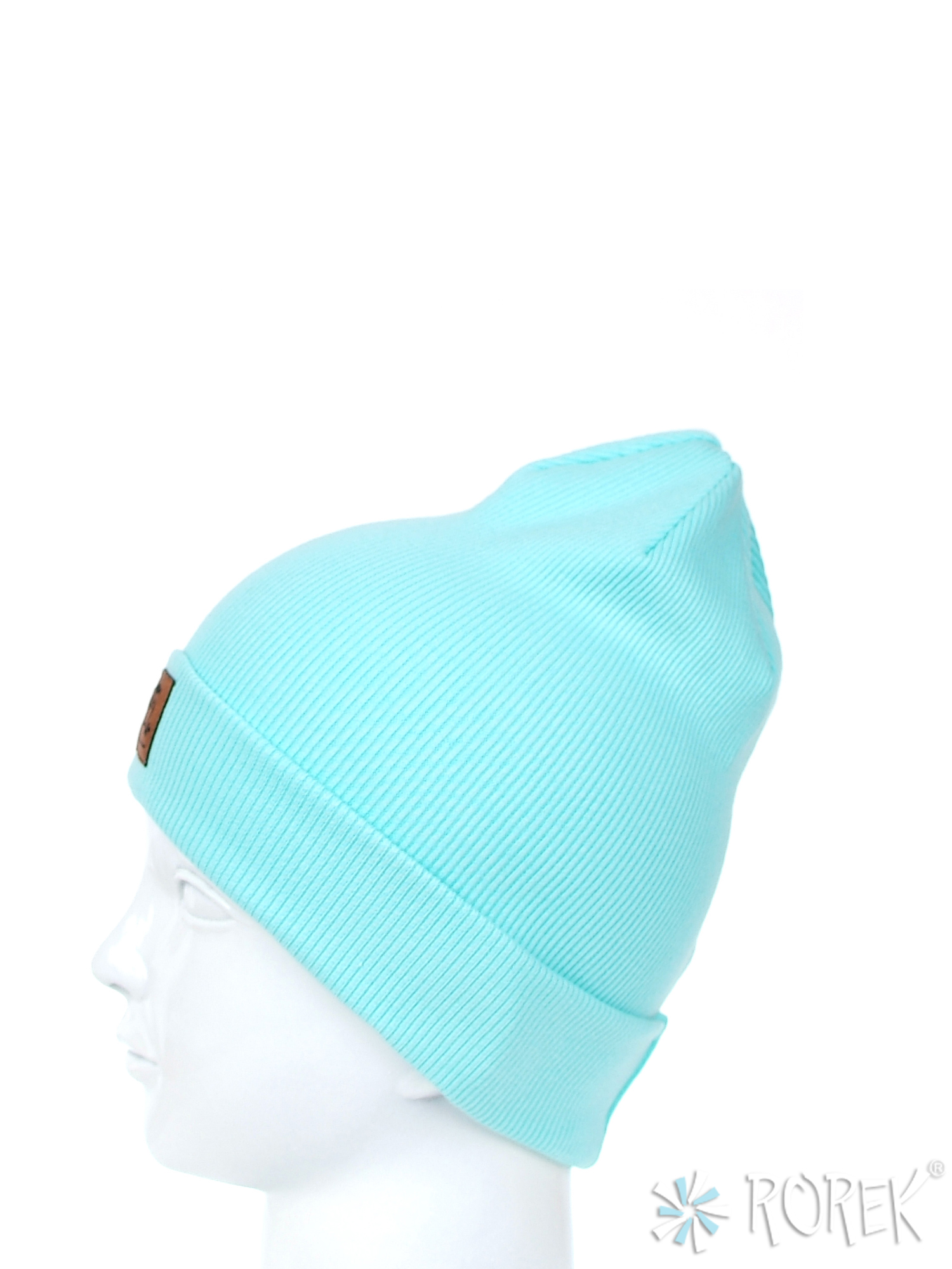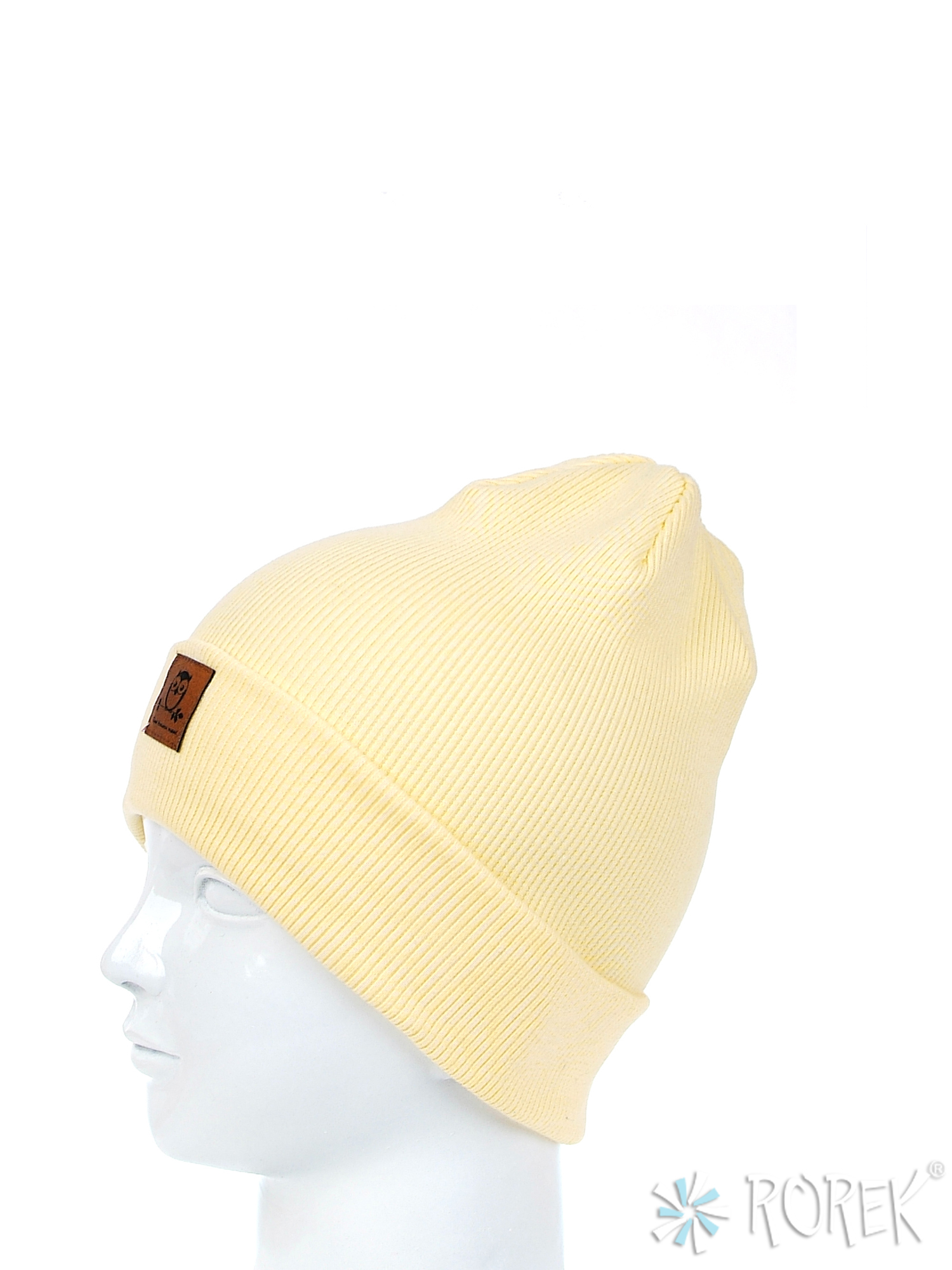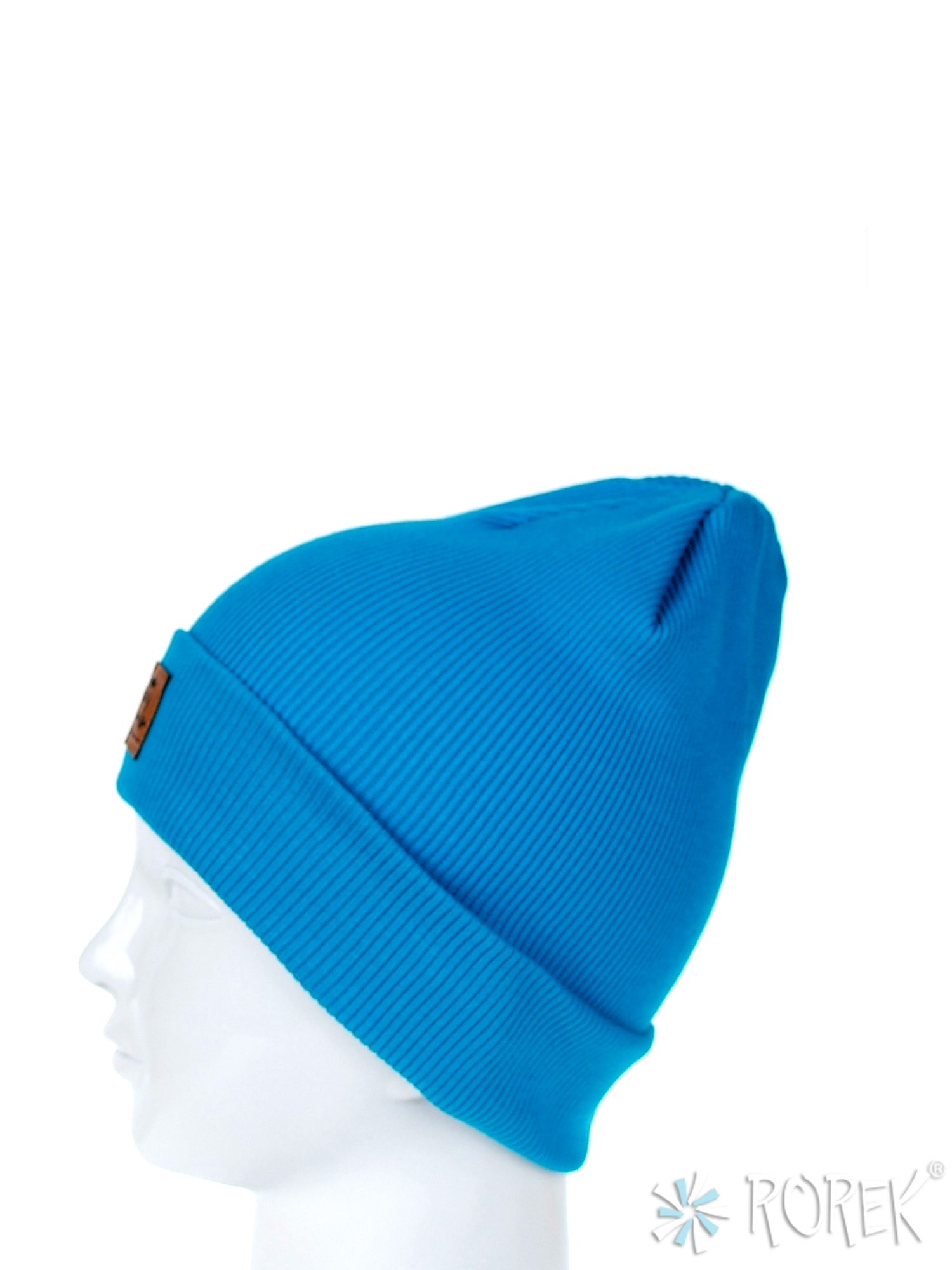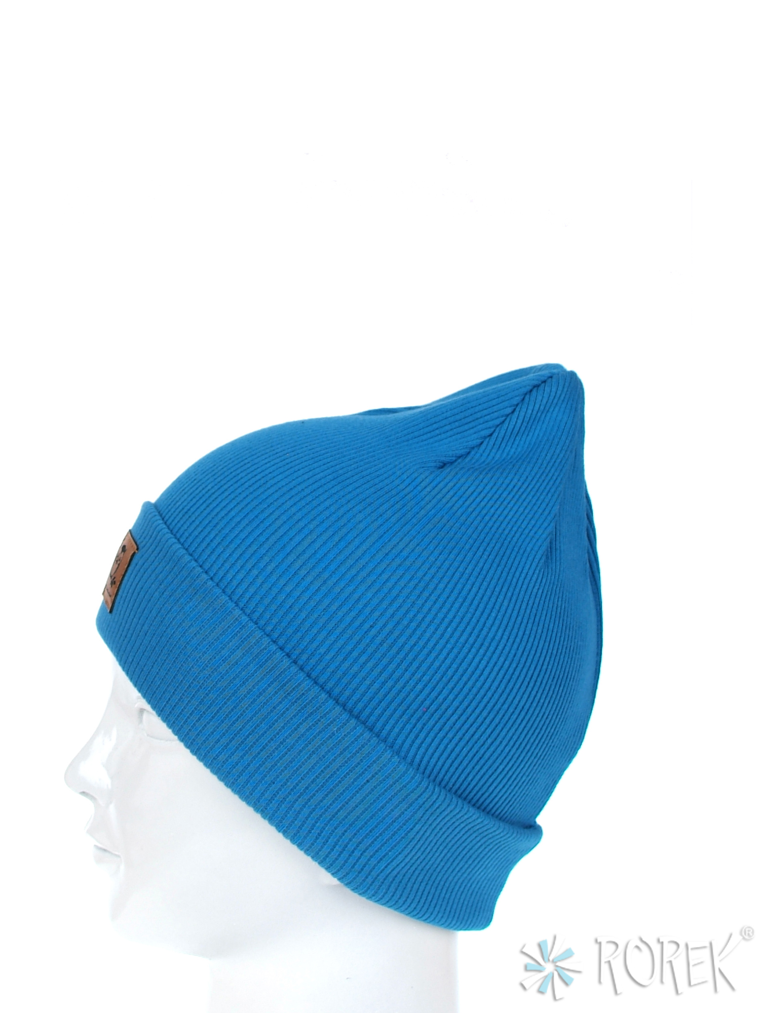 Elastyczna czapka beanie dla dzieci, szyta z bawełnianego ściągacza, przedłużana z tyłu, z wywinięciem, które umożliwia również regulację długości czapki. Z przodu zdobiona eko skórką z logo. Czapka bardzo wygodna, nie uciska głowy dziecka, nie opada na oczy.