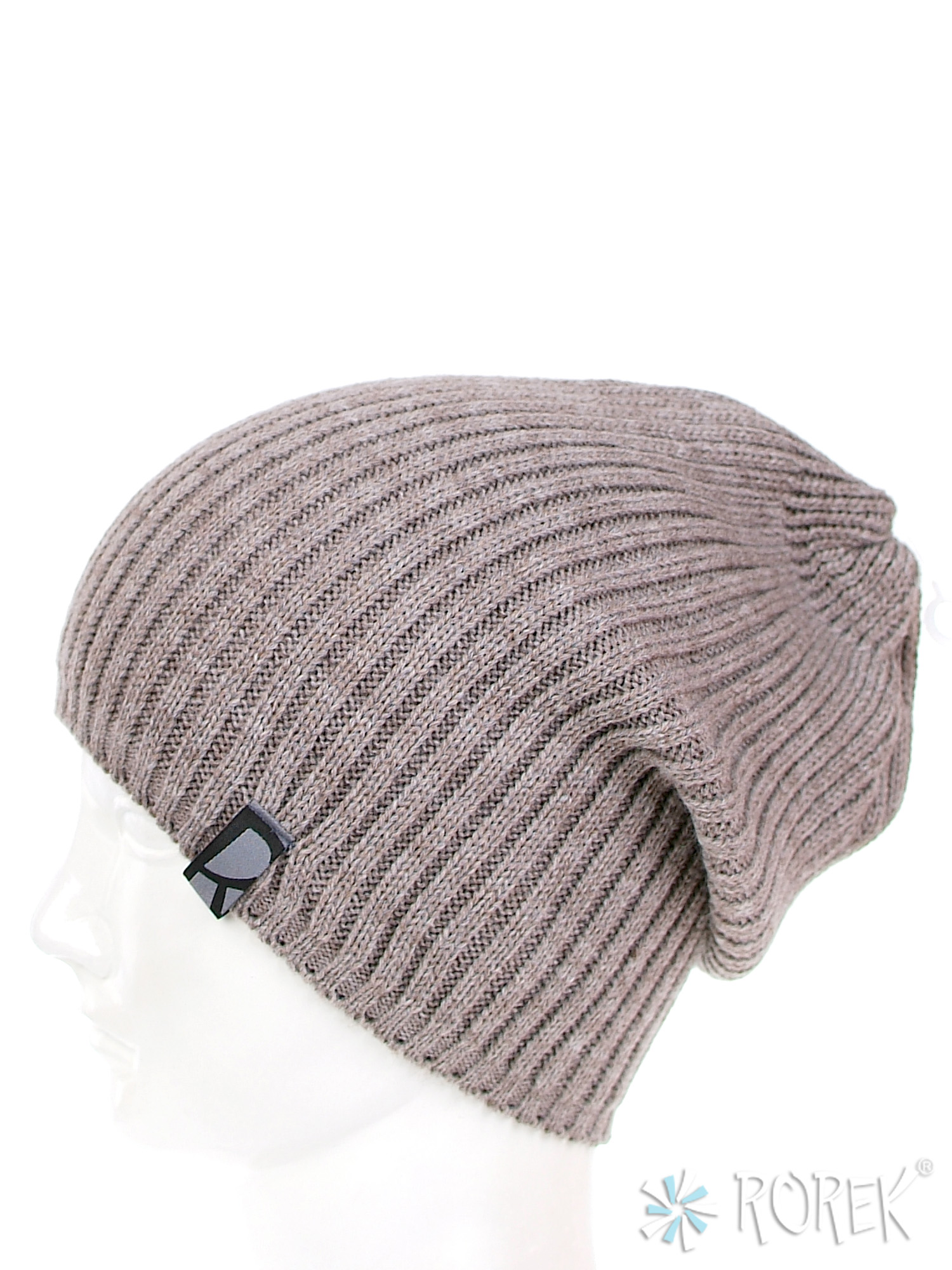Pojedyncza czapka damska krasnal w prążek, fason przedłużony z tyłu. Z przodu czapki naszywka z graficzną literką "R".