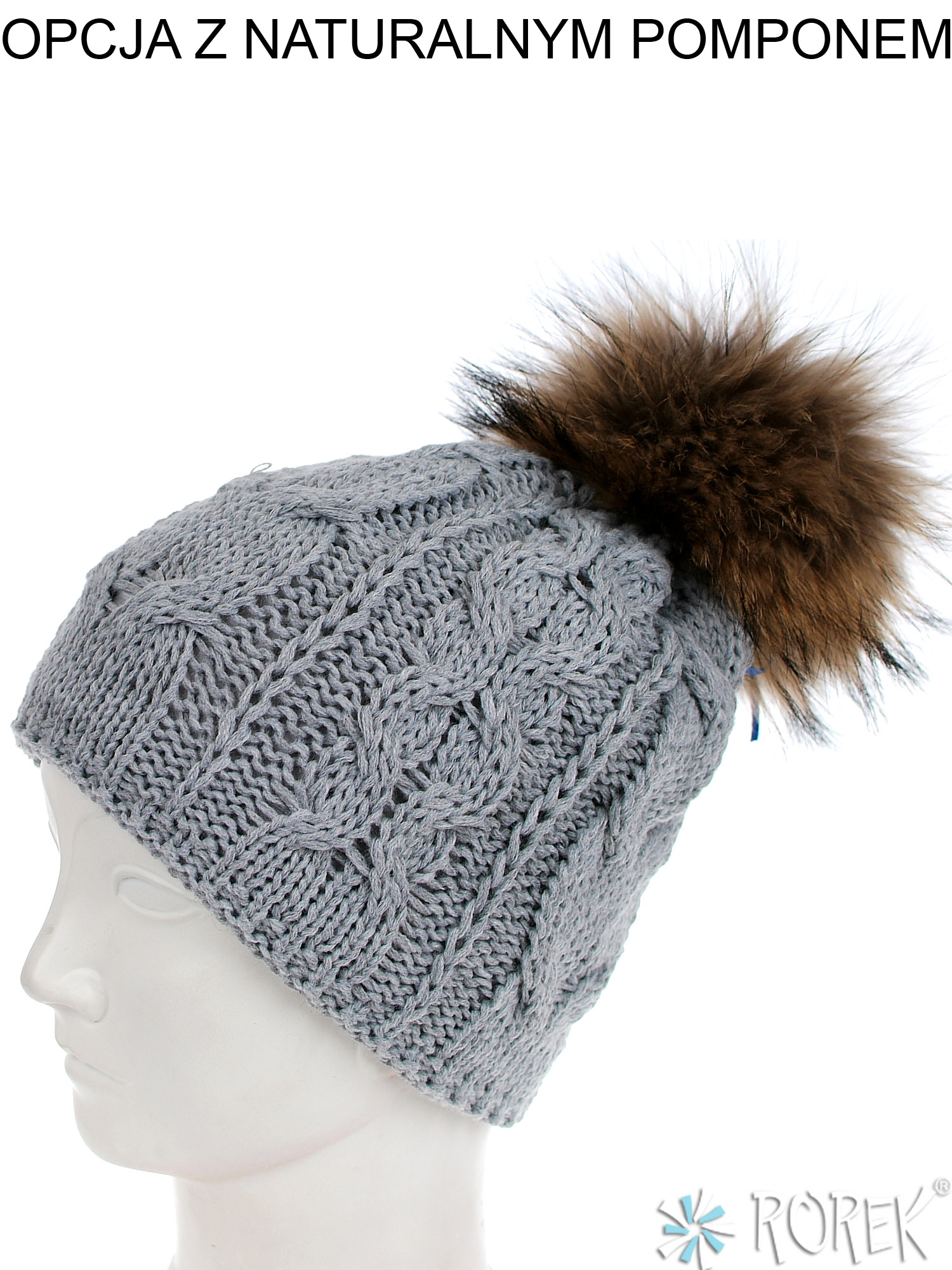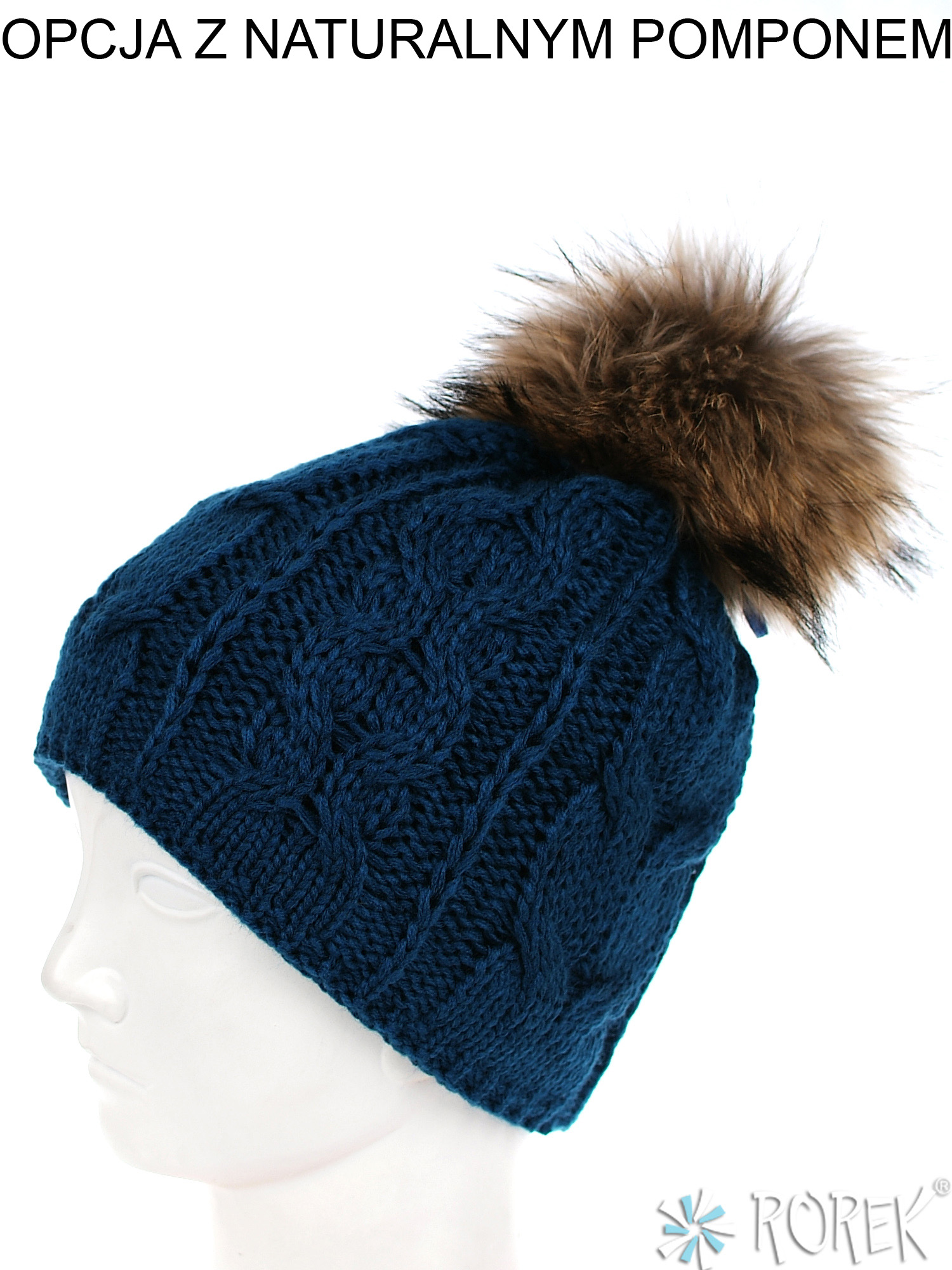 Czapka zimowa damska, o splocie grubego warkocza, który idealnie pasuje do komina ID: 3305. Środek czapki w całości podszyty polarem, możliwość ozdobienia czapki pomponem z jenota lub z ekologicznego futerka.