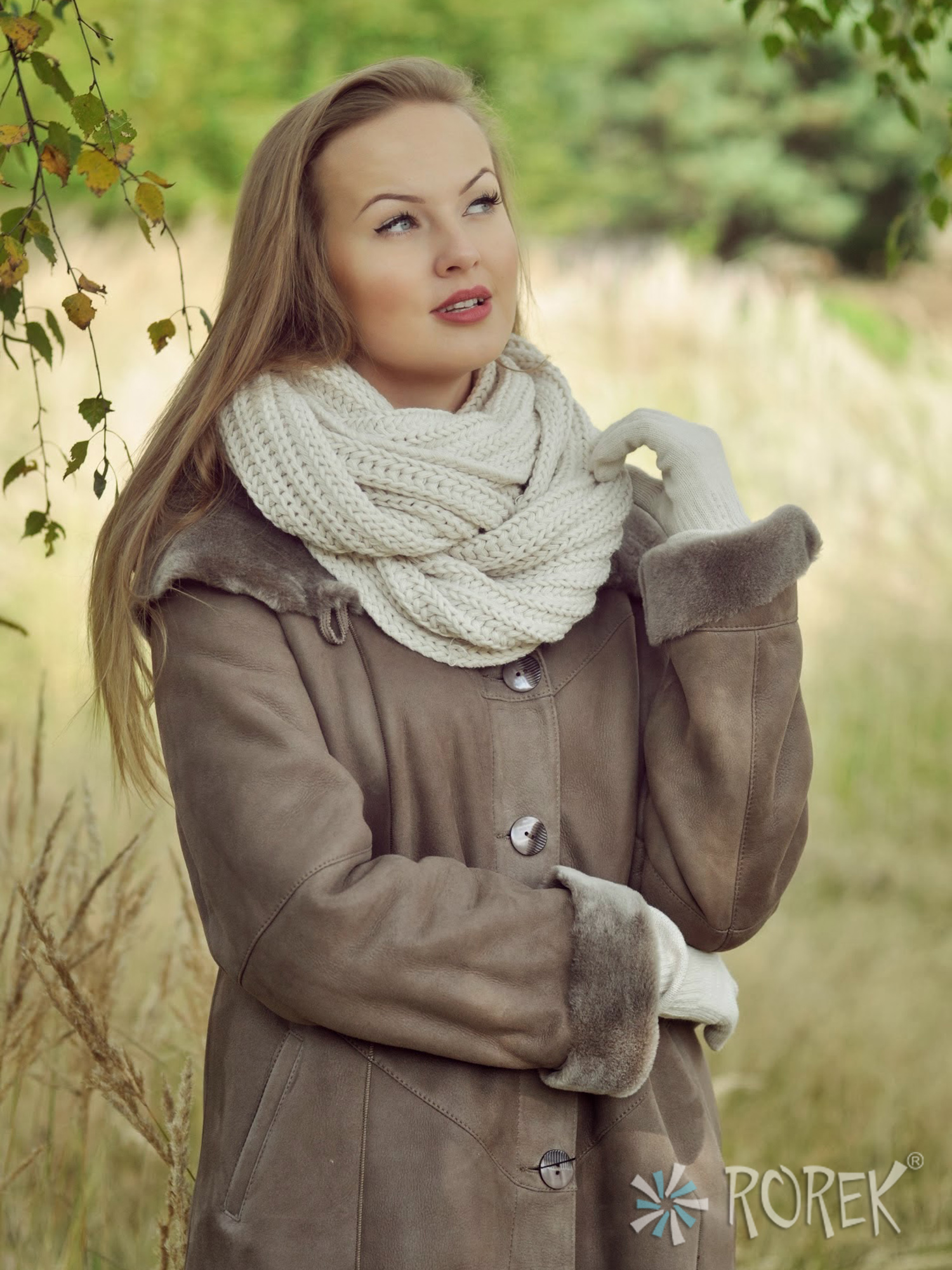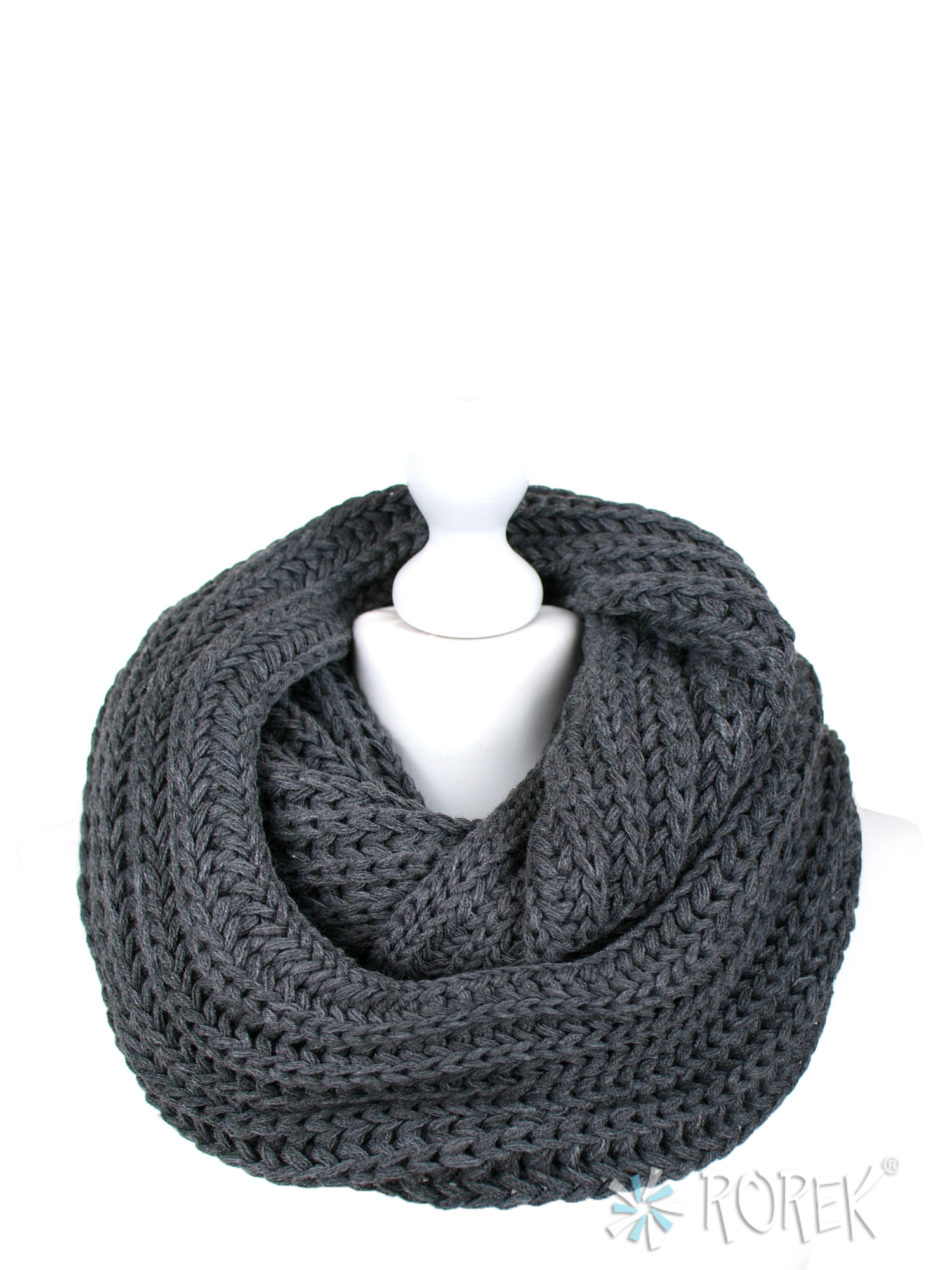 Komin damski o splocie "kłosa" zakładany w " ósemkę ", tworząc dwie warstwy wokół szyi.
