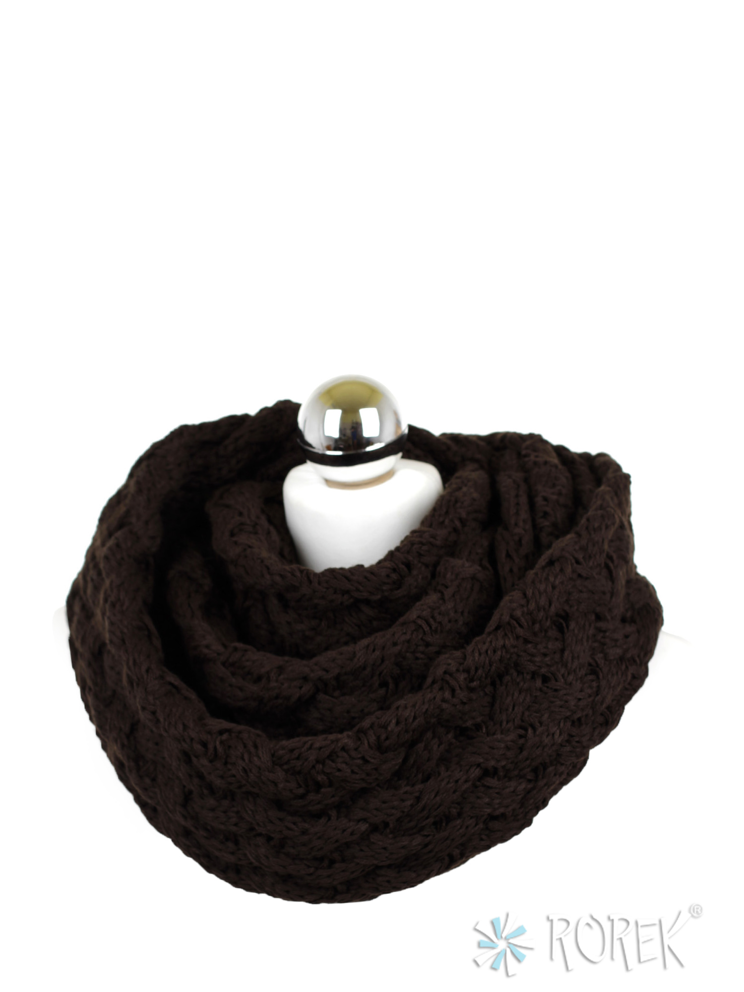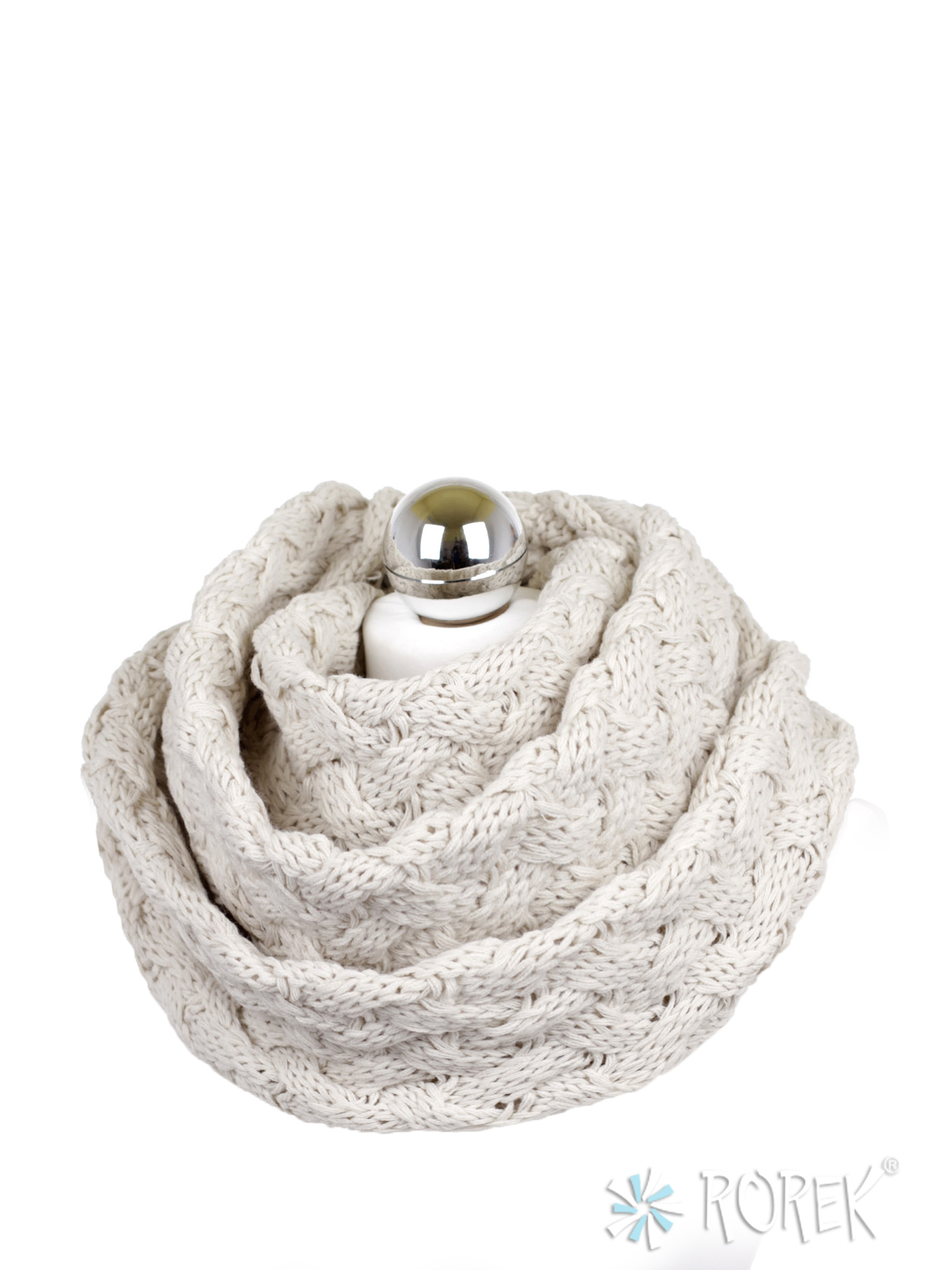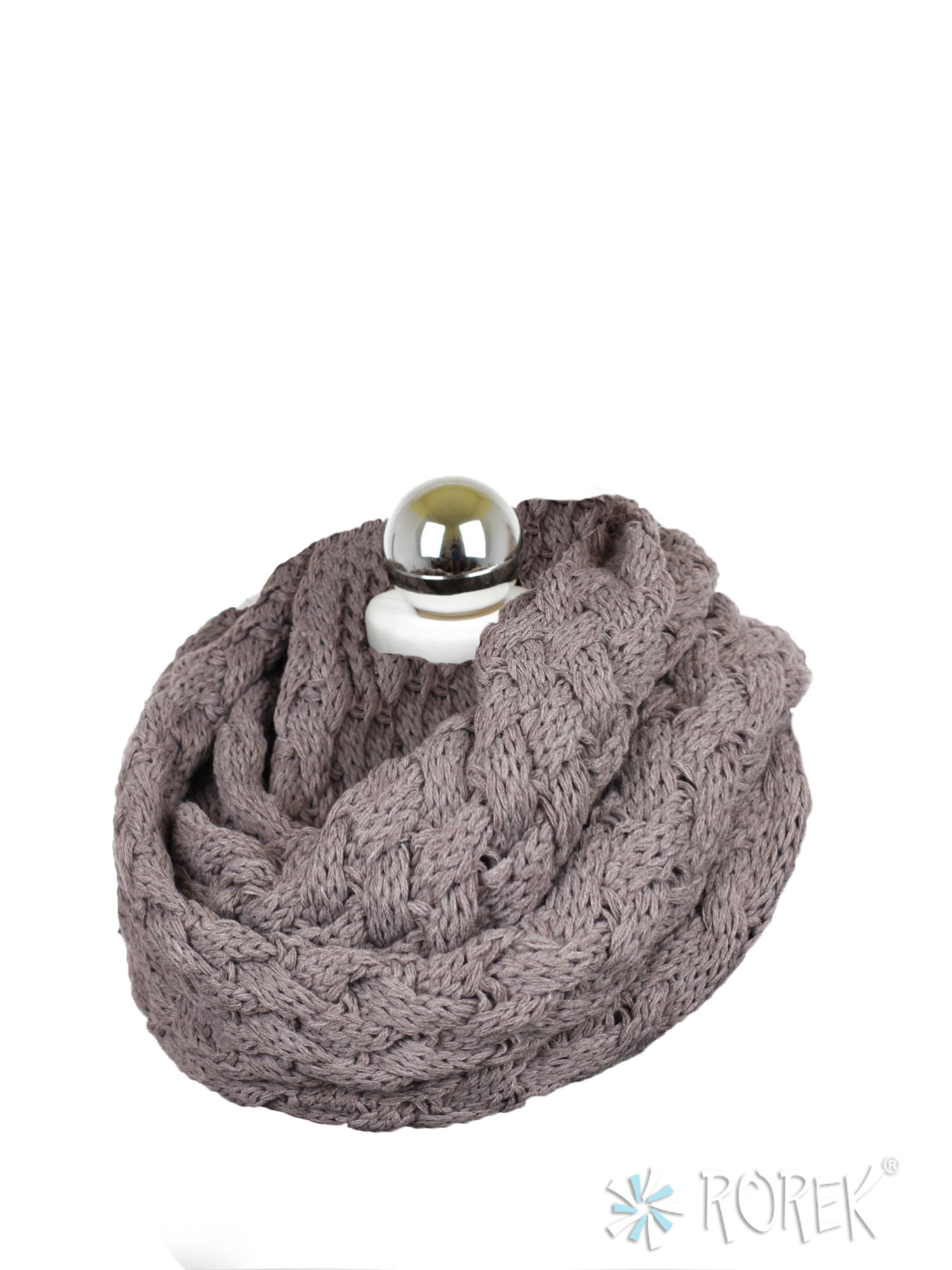 Komin damski zakładany w " ósemkę " o pięknym, przeplatanym, grubym splocie.