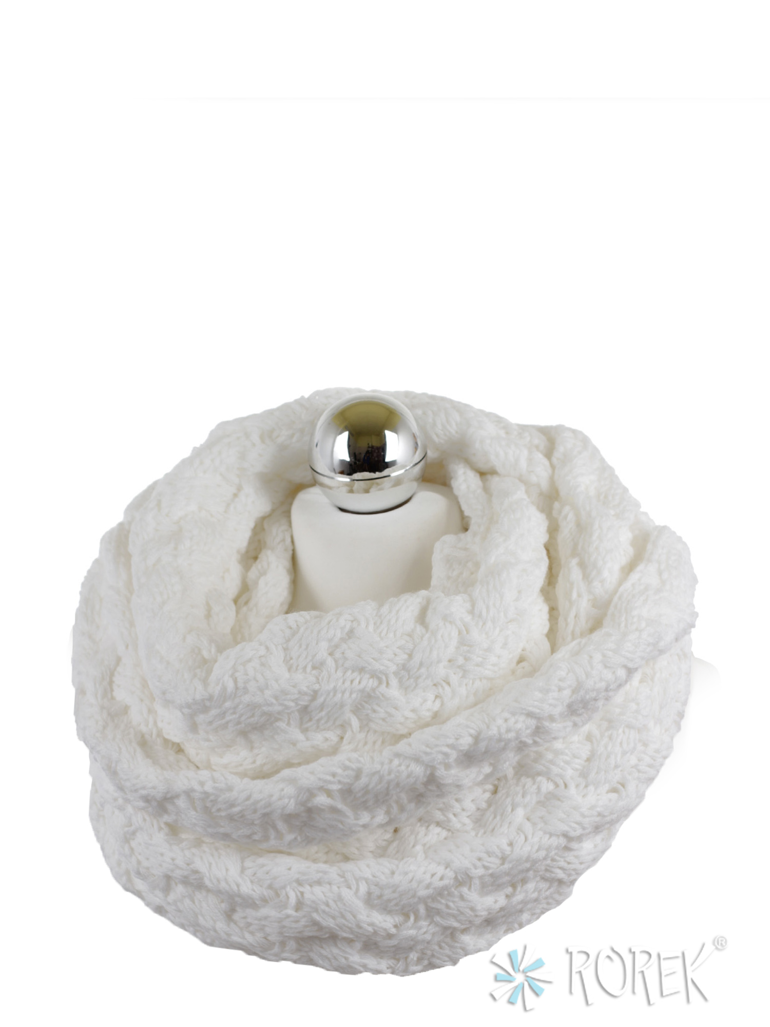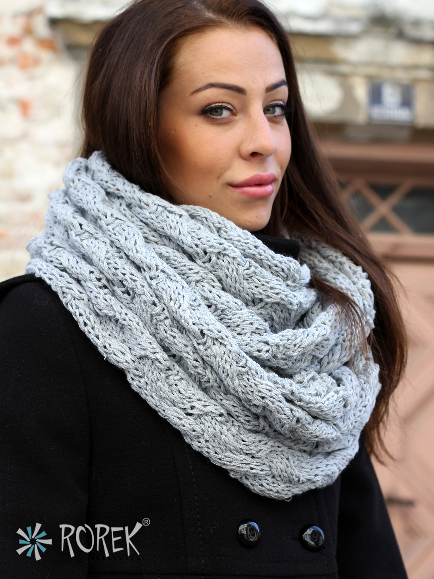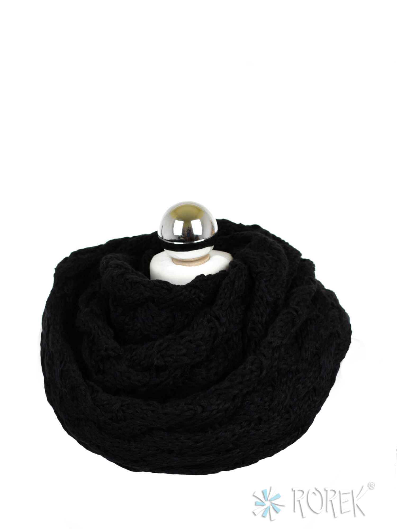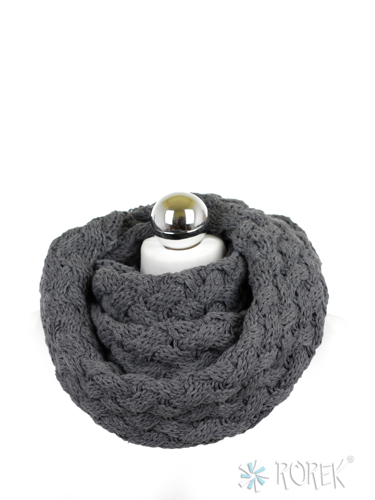 Komin damski zakładany w " ósemkę " o pięknym, przeplatanym, grubym splocie.