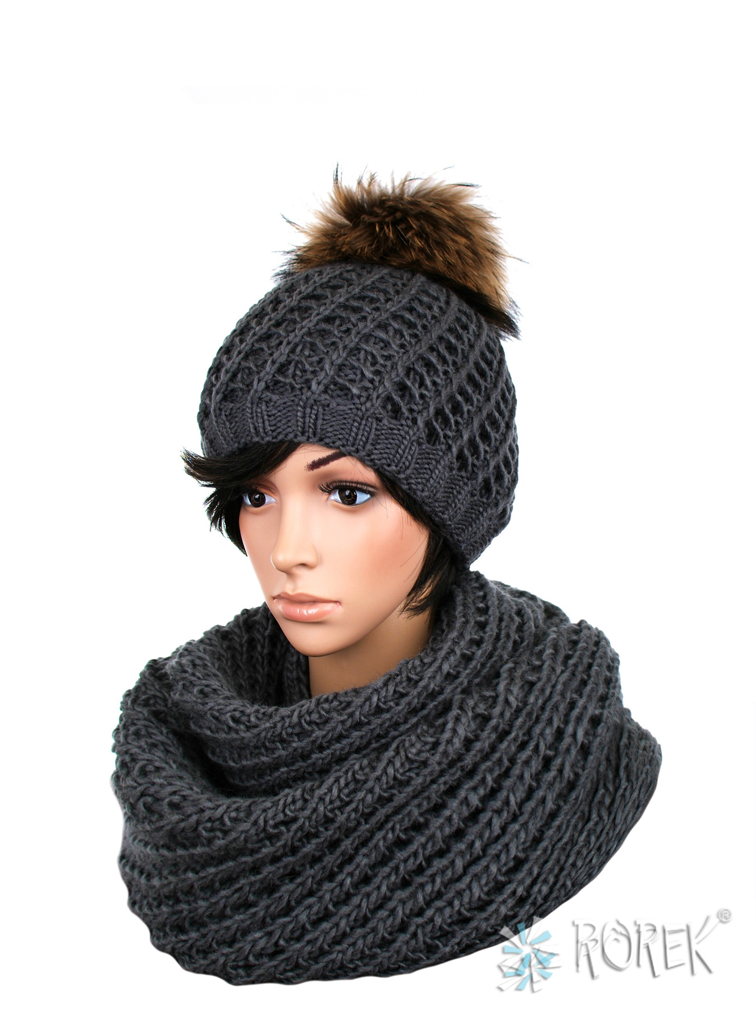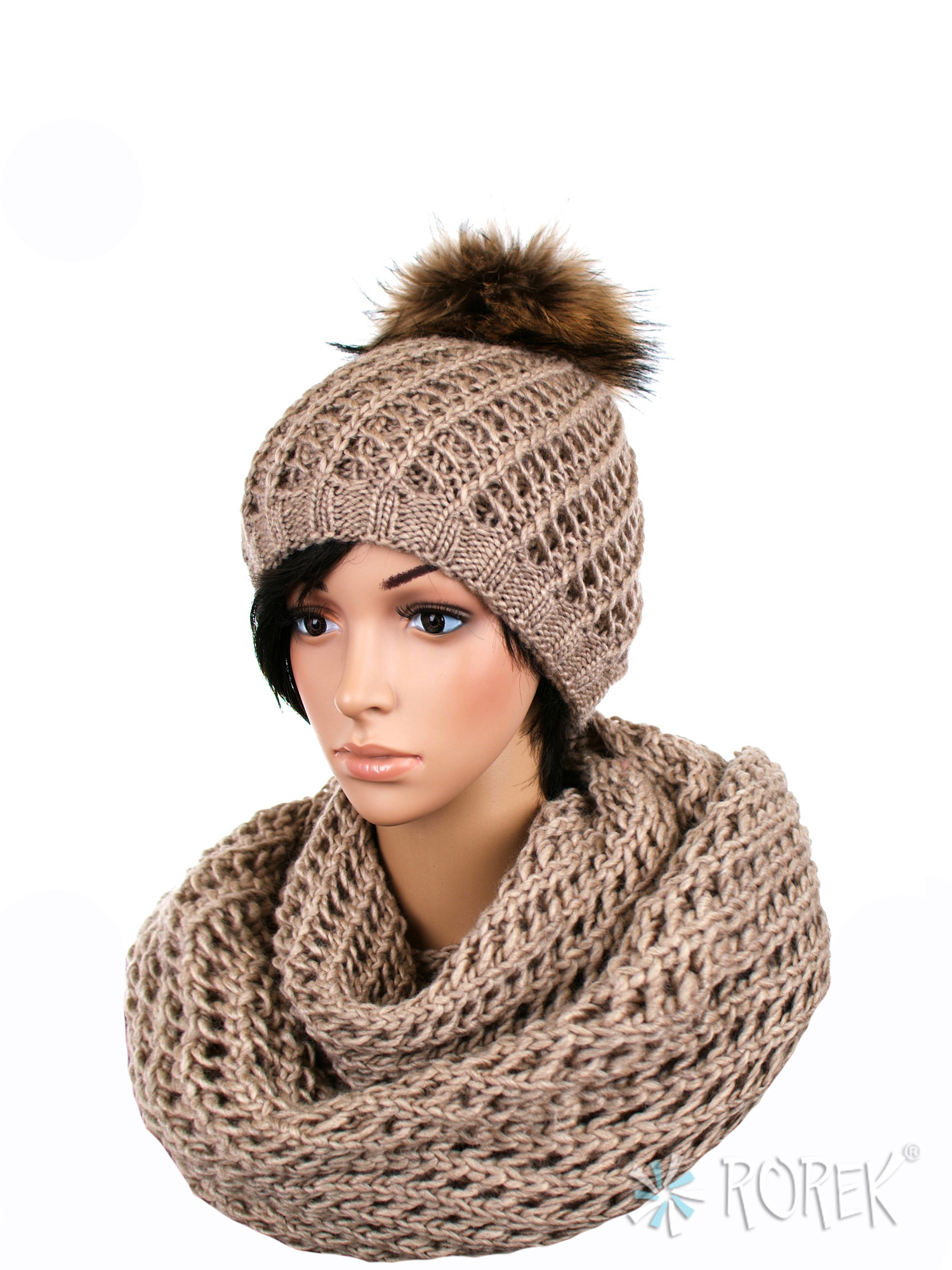 1) Czapka damska o prostym, klasycznym fasonie zdobiona splotem ażurowym ( na zewnątrz ) oraz pomponem z naturalnego futra z jenota. Czapka wykonana z podwójnej warstwy przędzy wzbogaconej wełną.