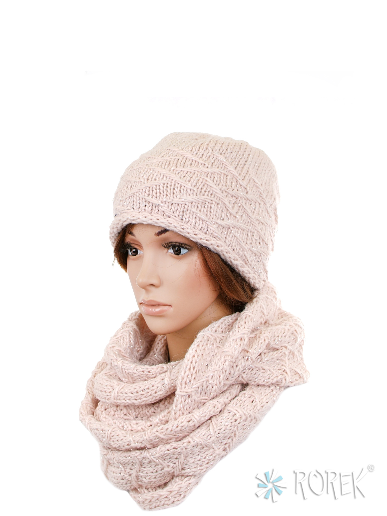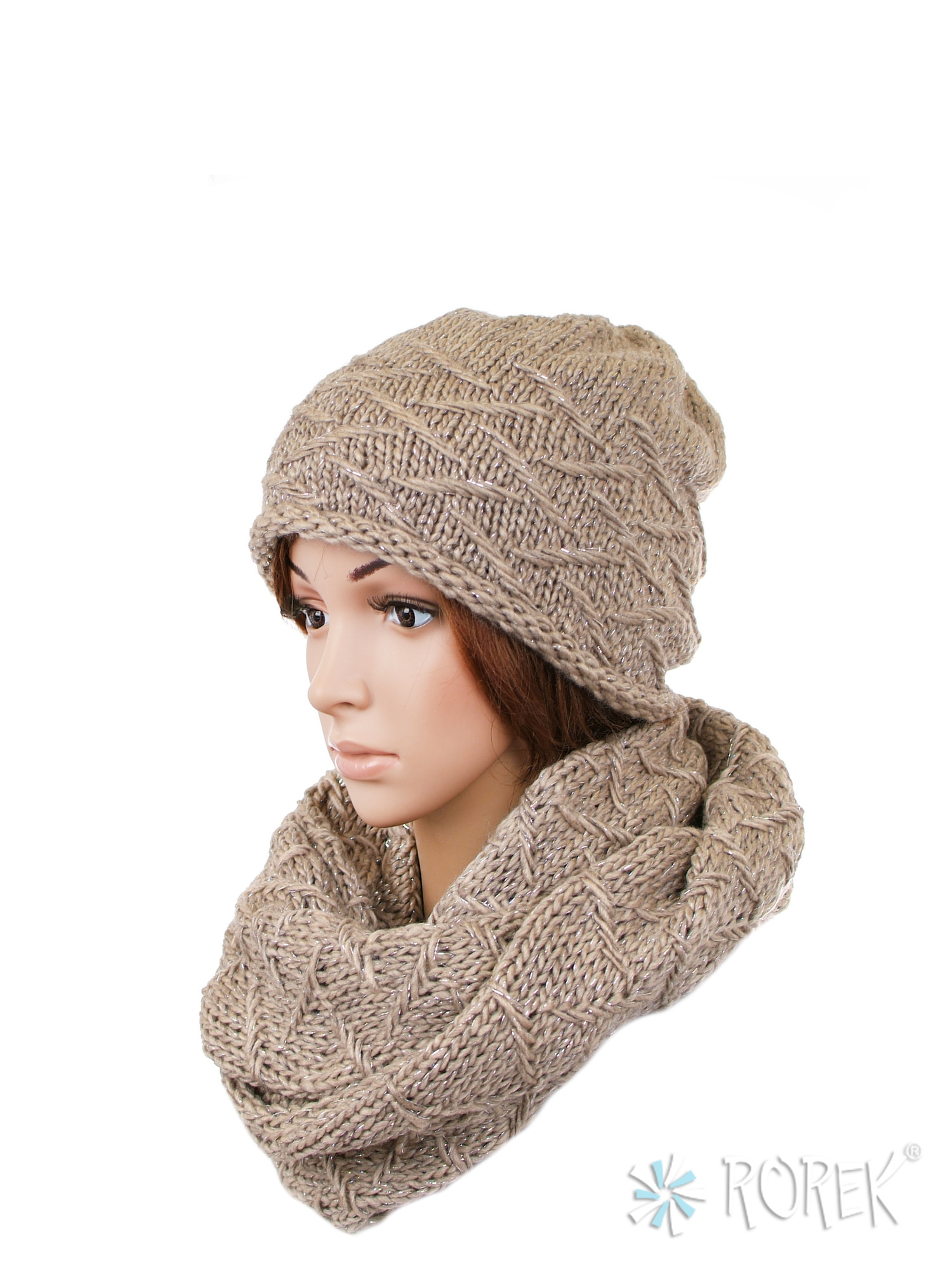 2) Ciepły i mięsisty komin damski, stanowiący komplet z czapką, wiązany na dwa razy wokół szyi.