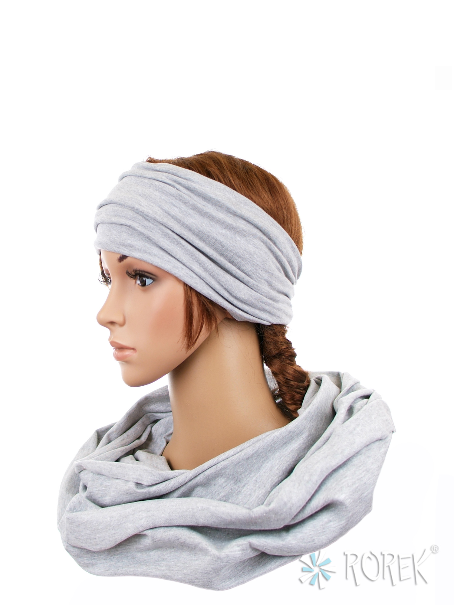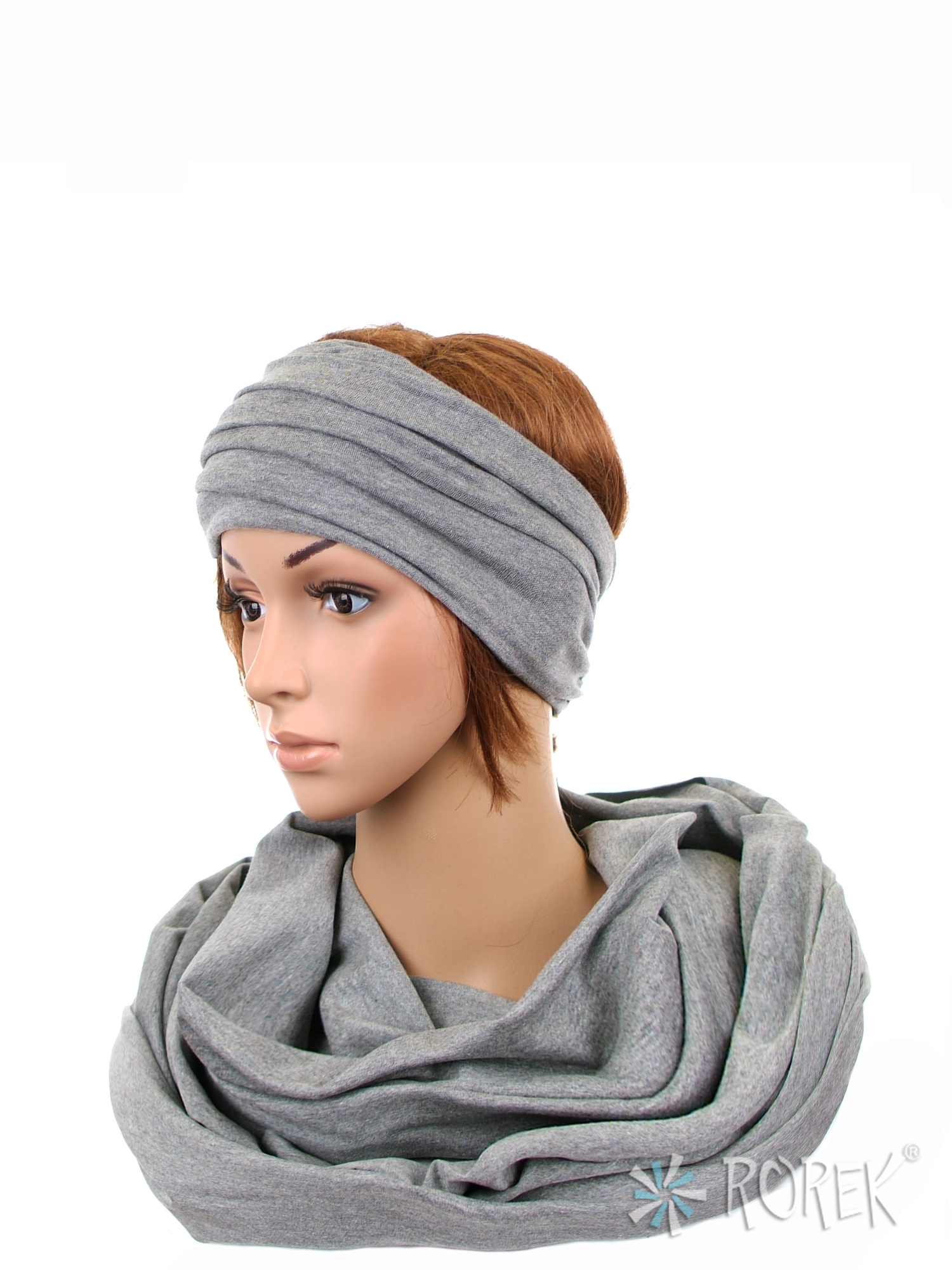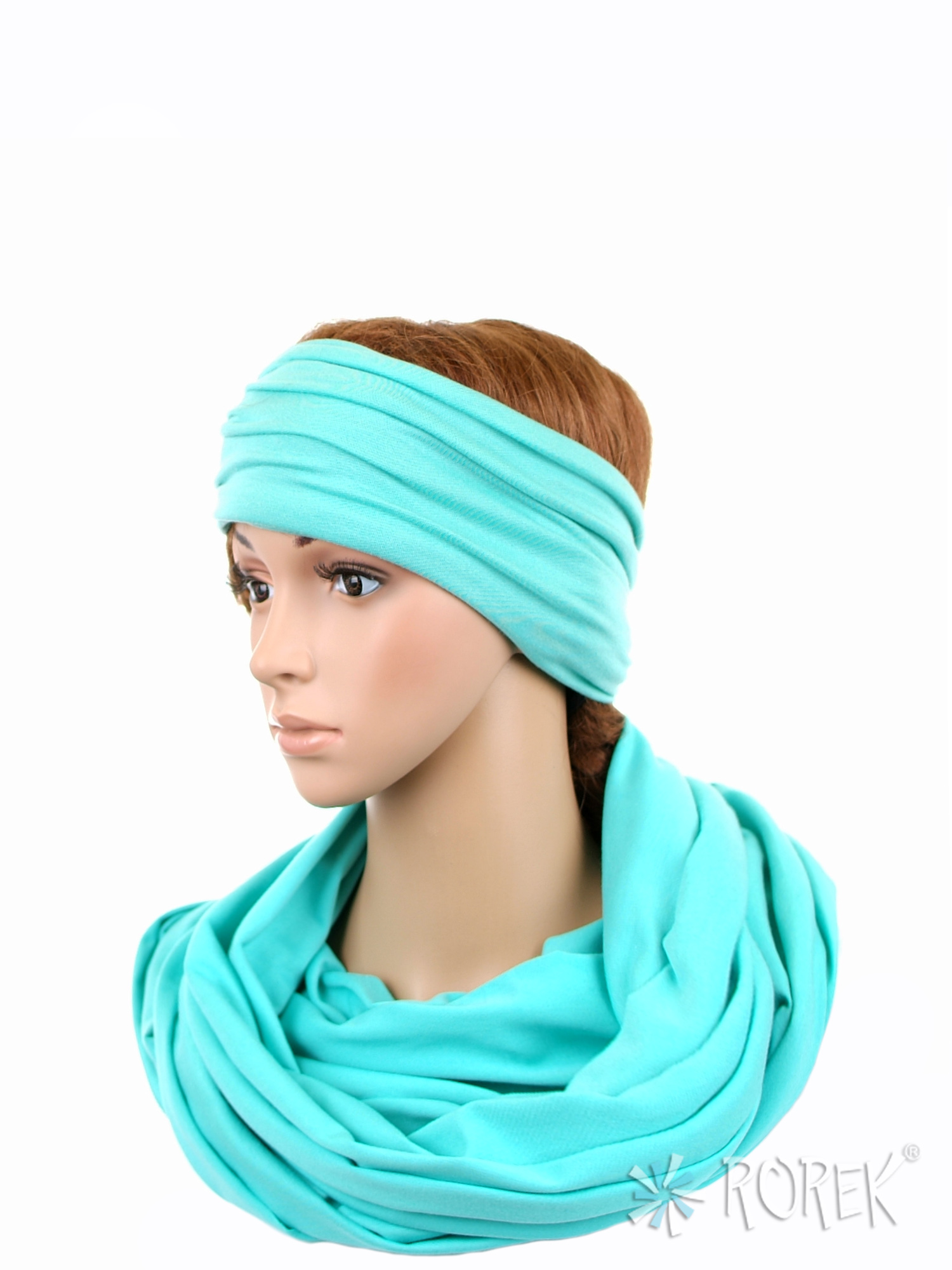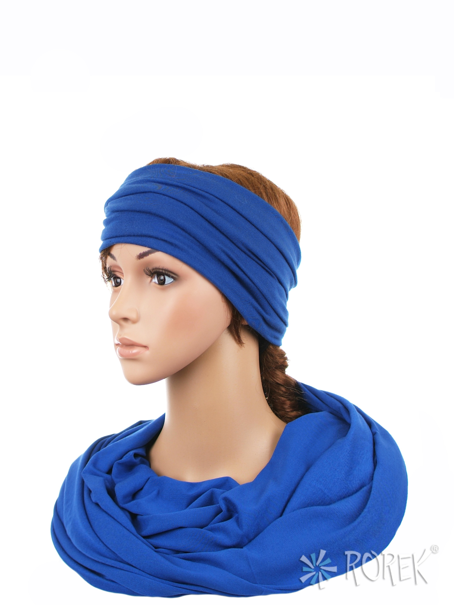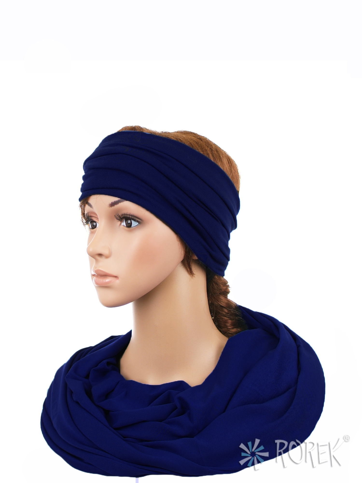 Komin damski wiązany w "ósemkę" w komplecie z szeroką, podwójnie szytą opaską ze ściągaczem - komplet wykonany z delikatnego i bardzo miłego w dotyku materiału 100 % bawełnianego, a dzięki niewielkiej ilości streczu, świetnie się poddaje.