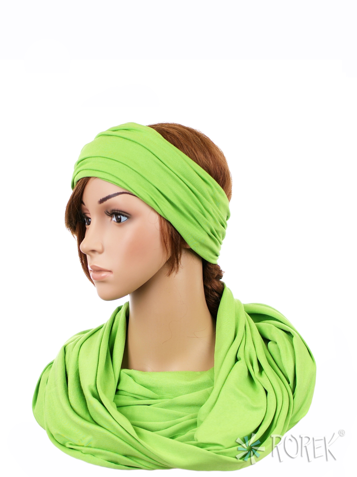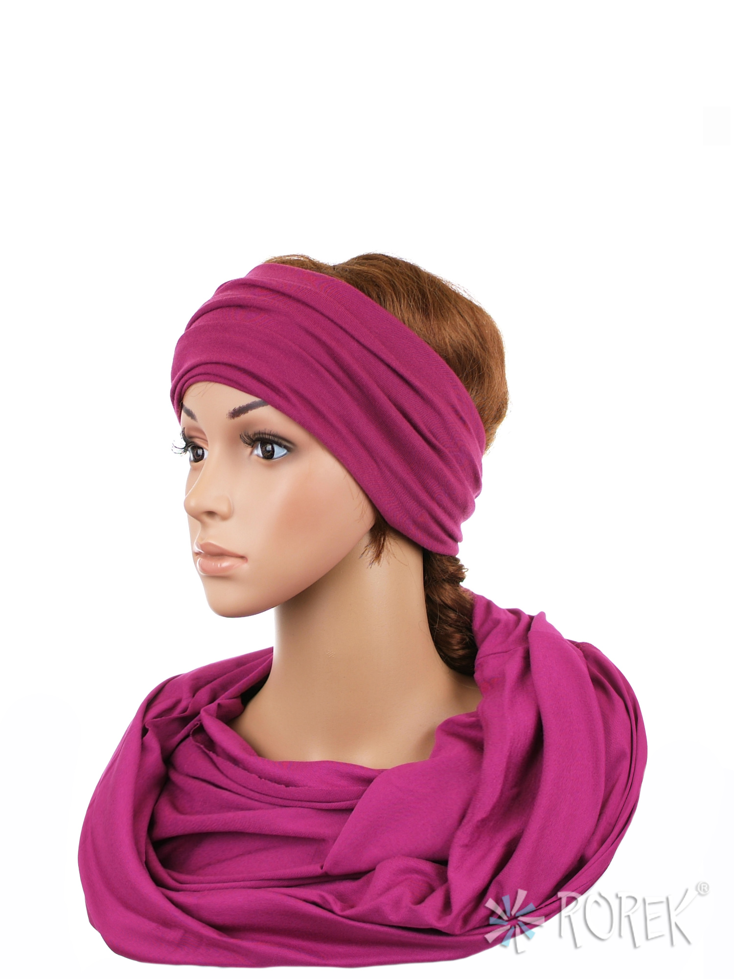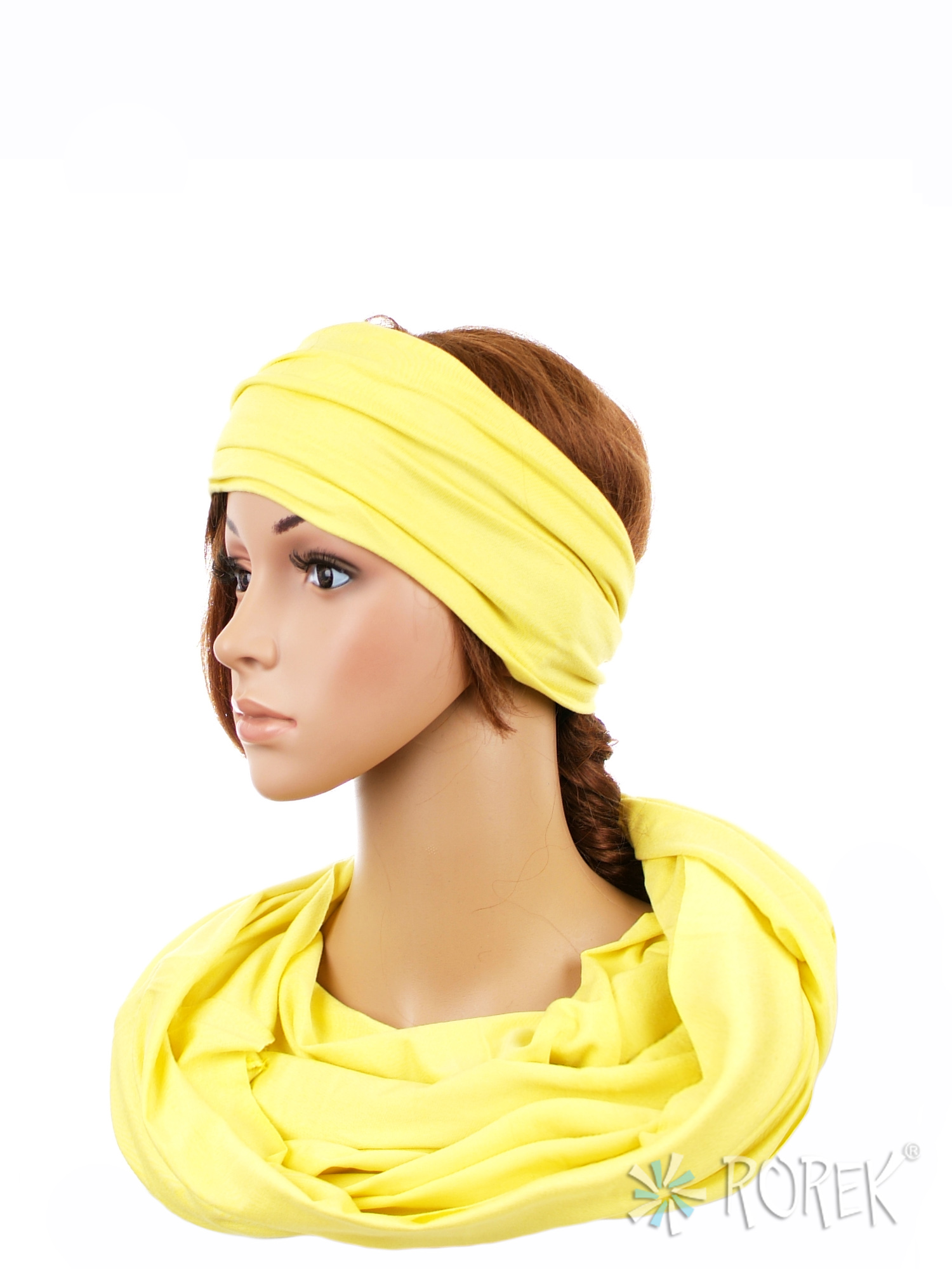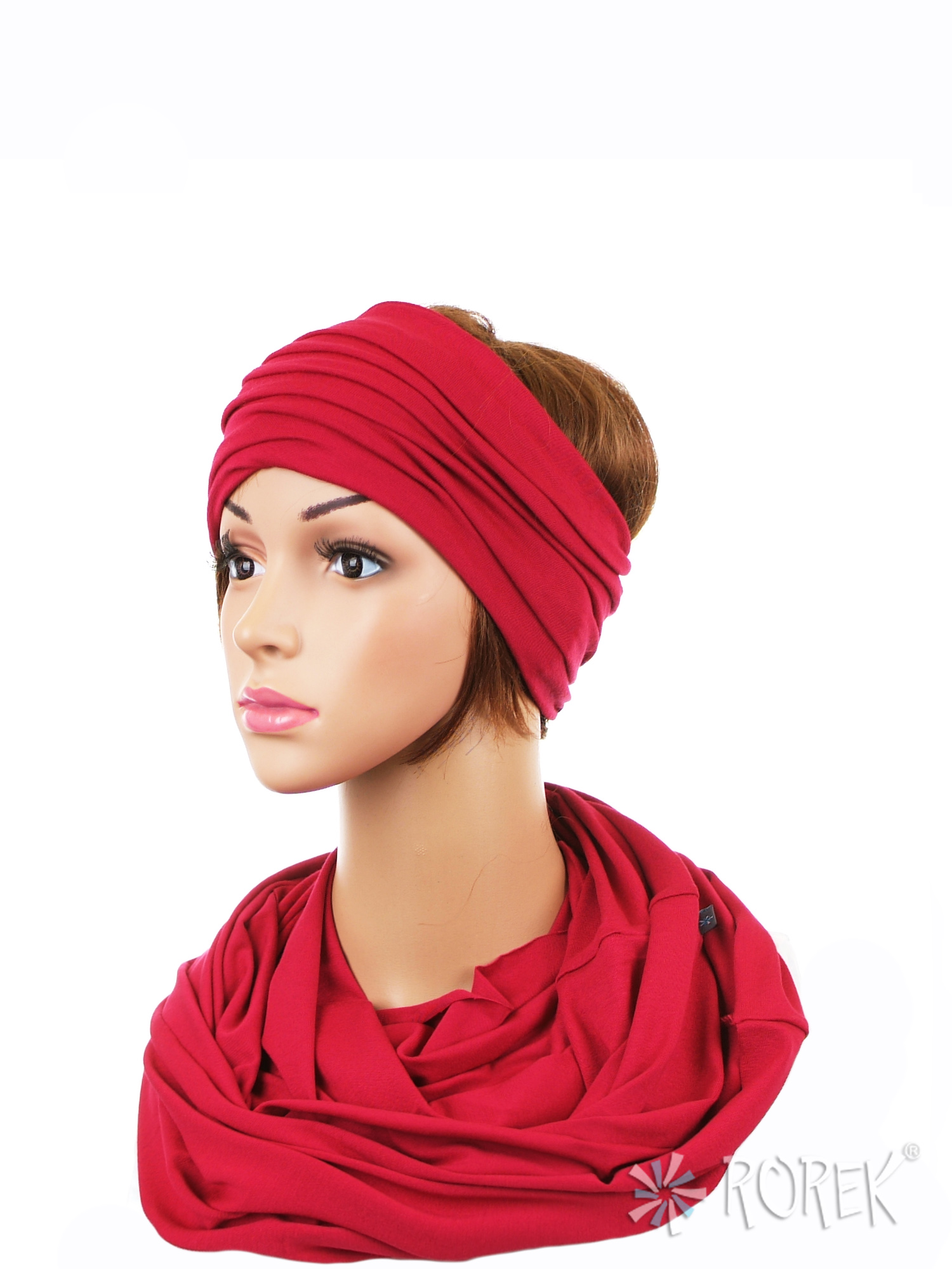 Komin damski wiązany w "ósemkę" w komplecie z szeroką, podwójnie szytą opaską ze ściągaczem - komplet wykonany z delikatnego i bardzo miłego w dotyku materiału 100 % bawełnianego, a dzięki niewielkiej ilości streczu, świetnie się poddaje.