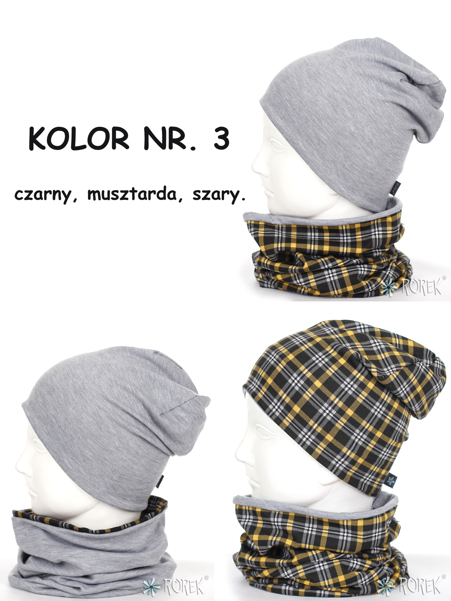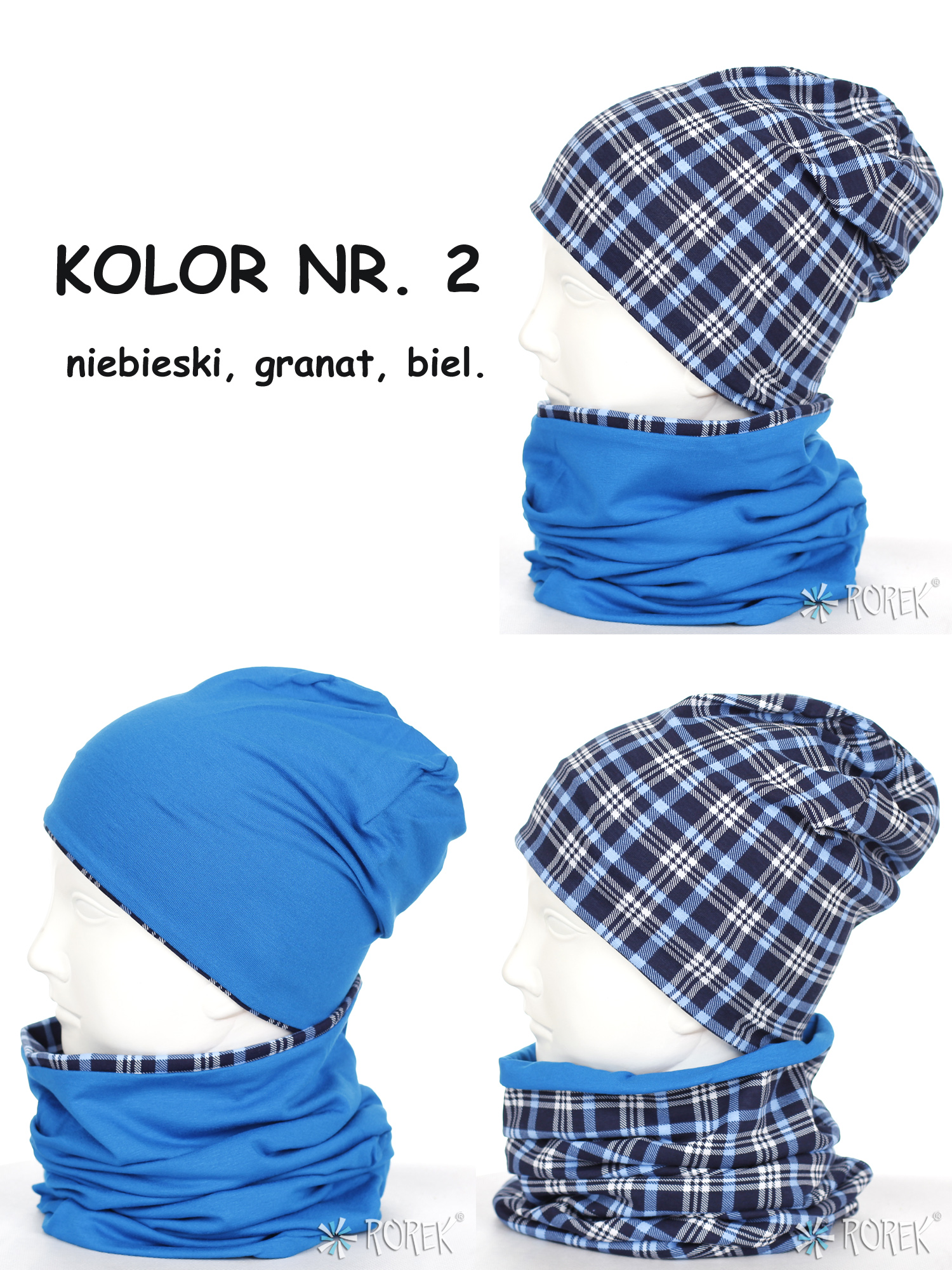 Komplet dziecięcy czapka krasnal + komin , dwustronny, dzięki czemu można go nosić na 4 różne sposoby. Komplecik wykonany z bardzo miłego i delikatnego w dotyku materiału bawełnianego, idealnego na wiosenno - jesienne dni. Czapka z kominem dostępna jest w różnych kombinacjach kolorystycznych.
