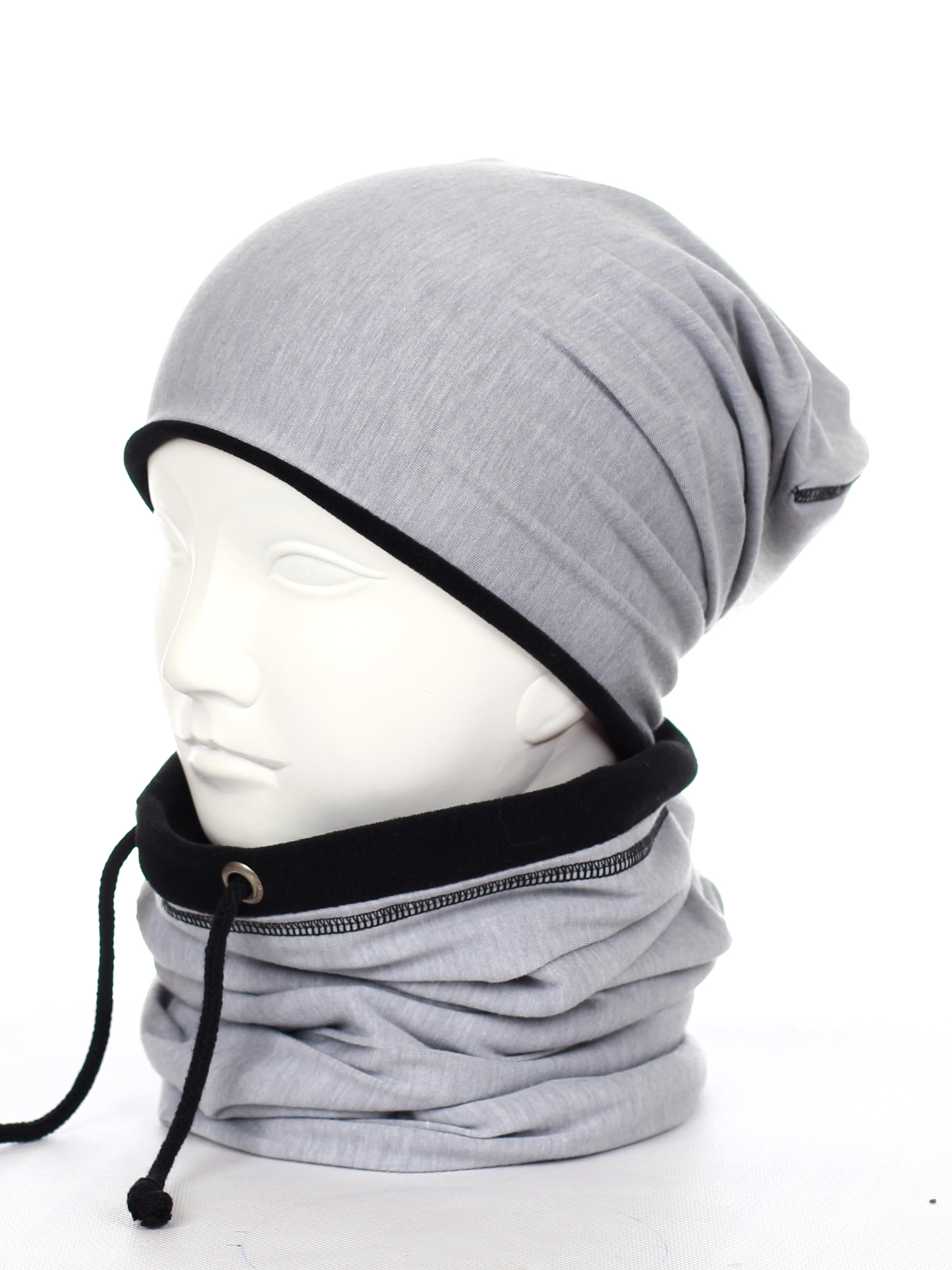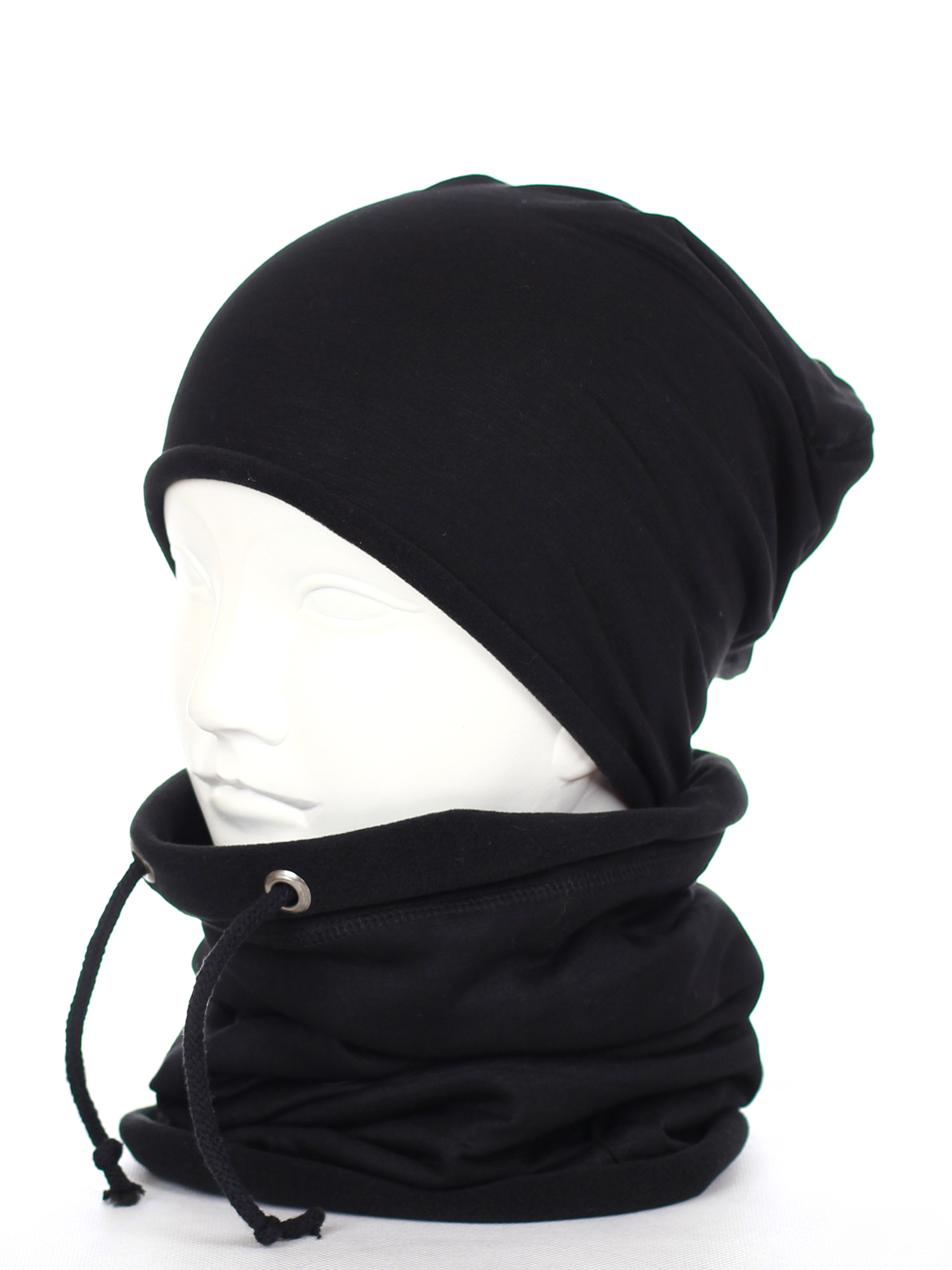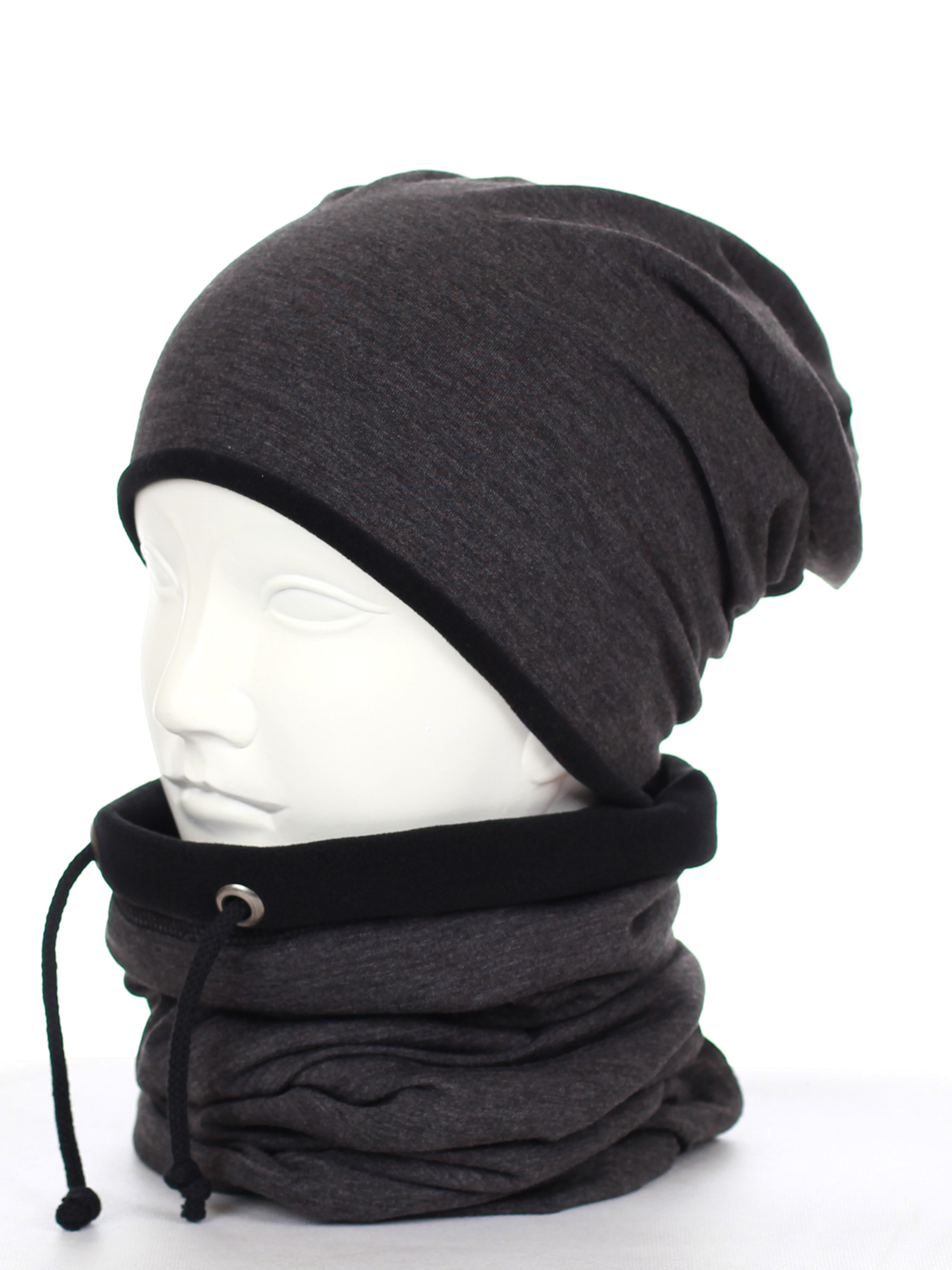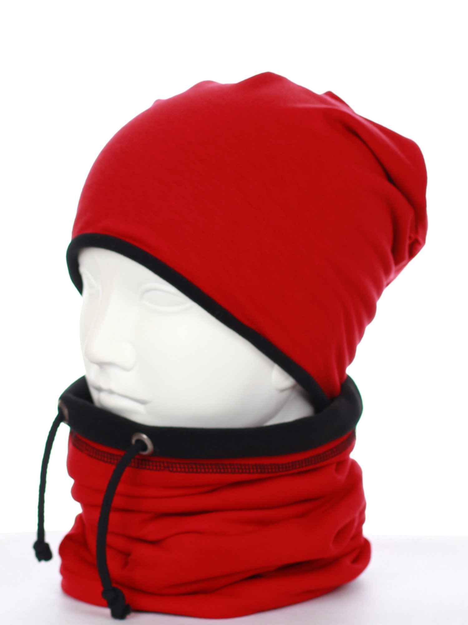 Komin - tuba, zakładany przez głowę, posiada sznureczki do regulacji, również podszyty ciepłym polarem.