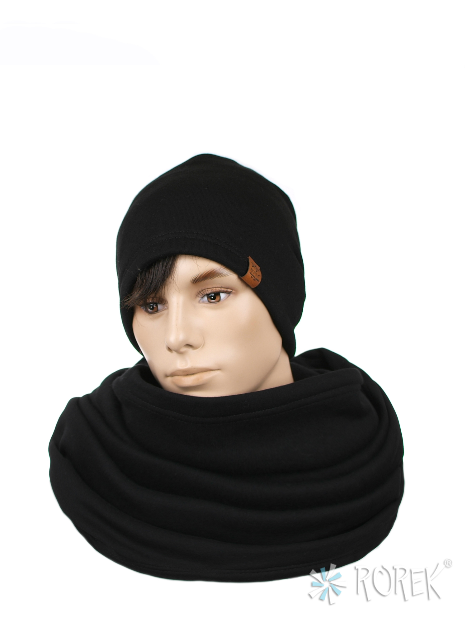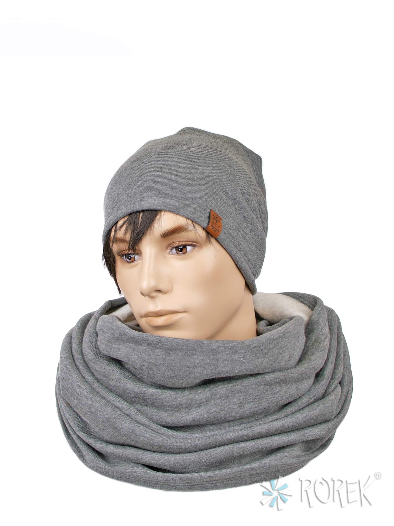 1) Czapka lekko przedłużana z tyłu, szyta z pojedynczej warstwy materiału dresowego "drapanego" - wewnętrzna część to meszek, dzięki któremu czapka i komin są cienkie, ale ciepłe.