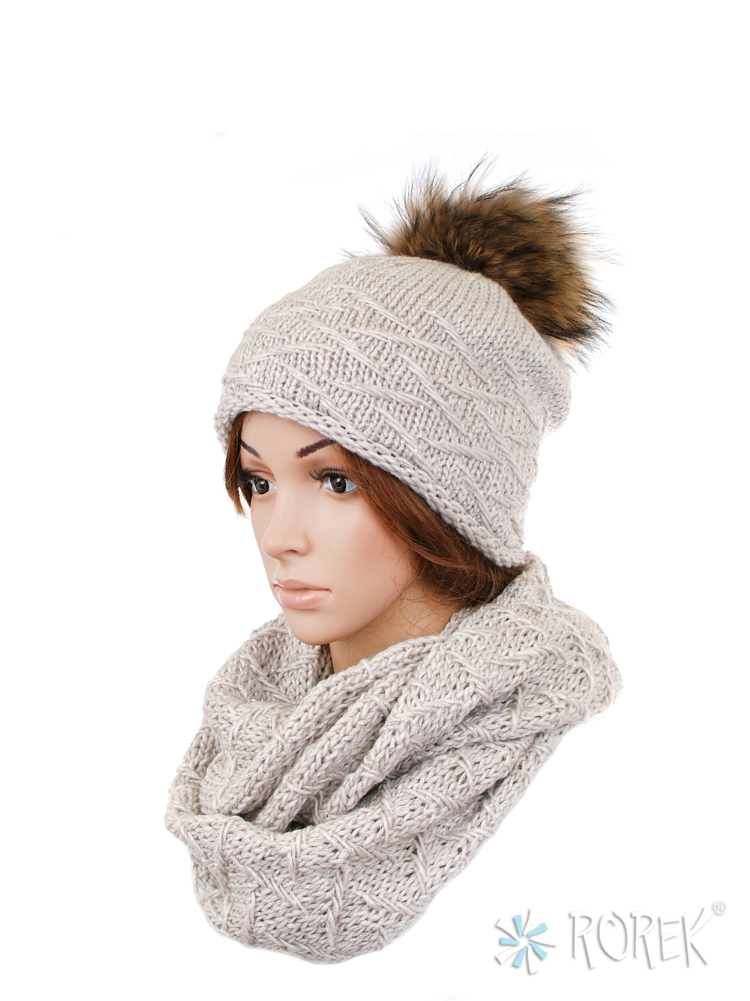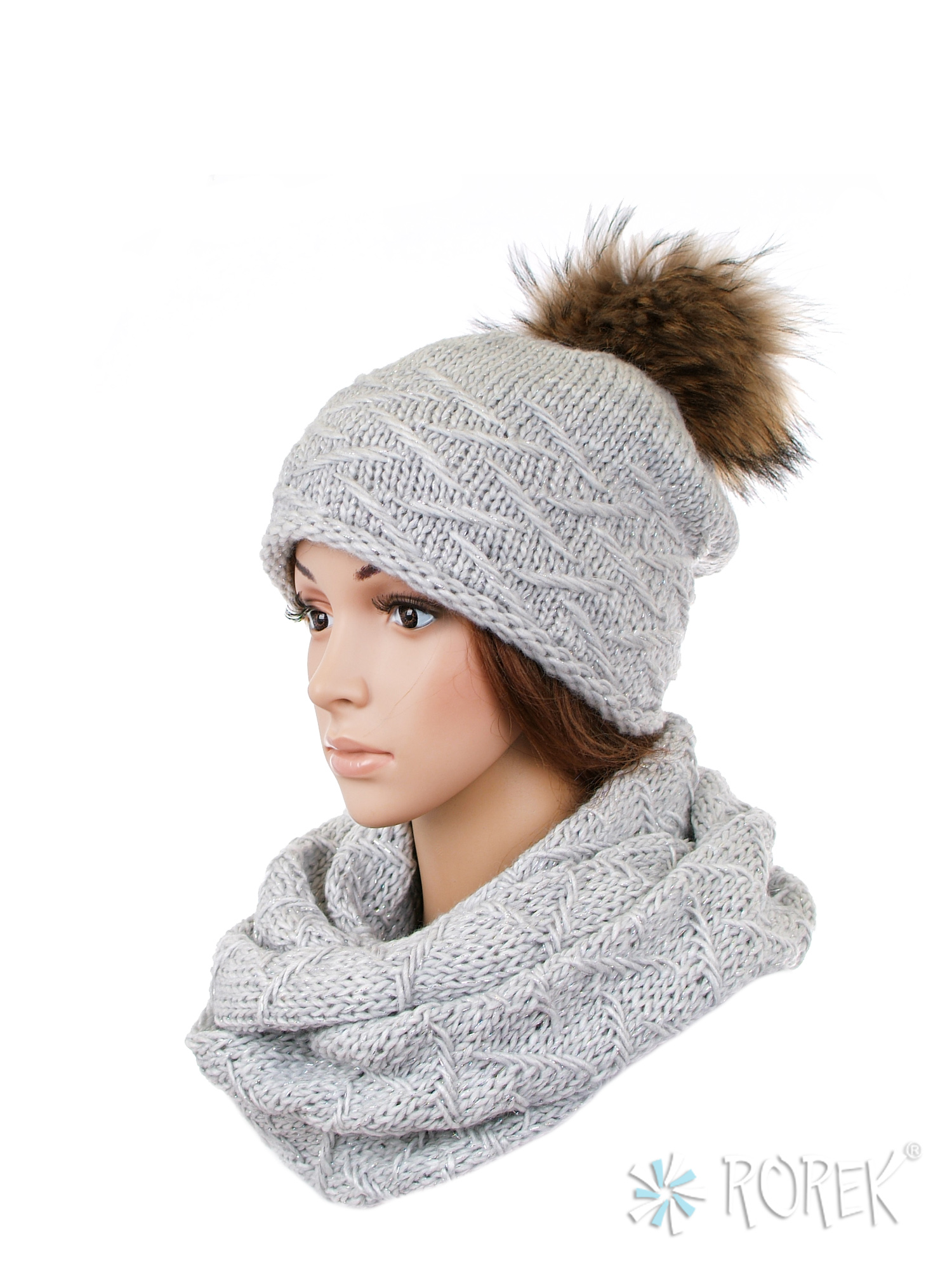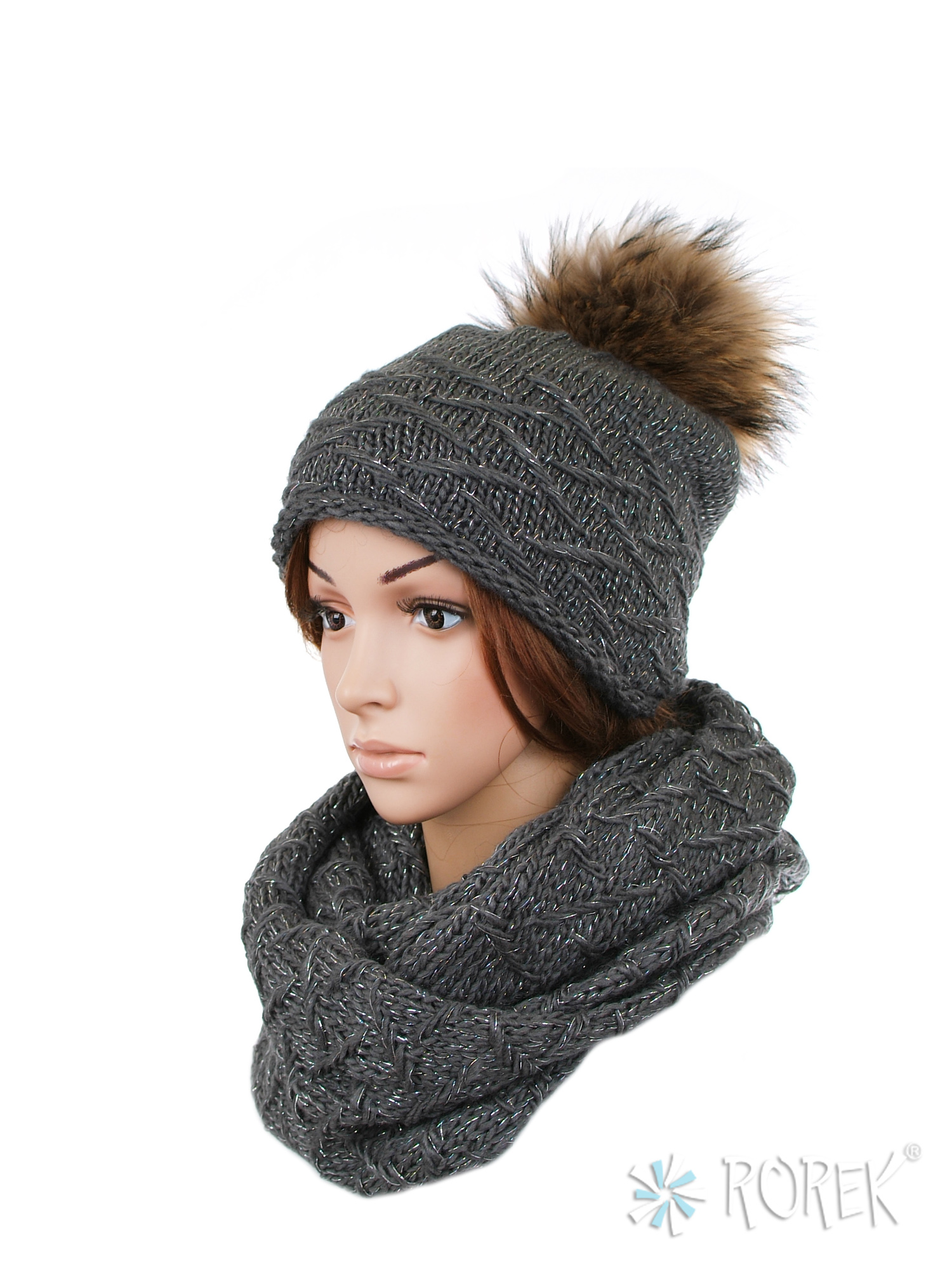 1) Czapka damska o lekkim, klasycznym fasonie zdobiona srebrną nicią. Ciepła, wykonana z pojedynczej warstwy przędzy wzbogaconej wełną i podszyta dodatkowo polarem TERMO. Pompon z naturalnego futra z jenota stanowi ciekawy dodatek.