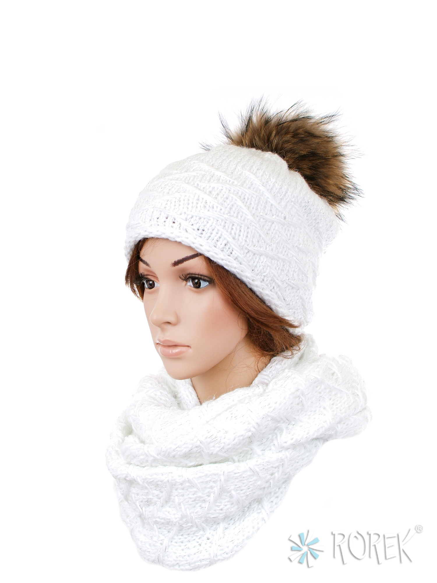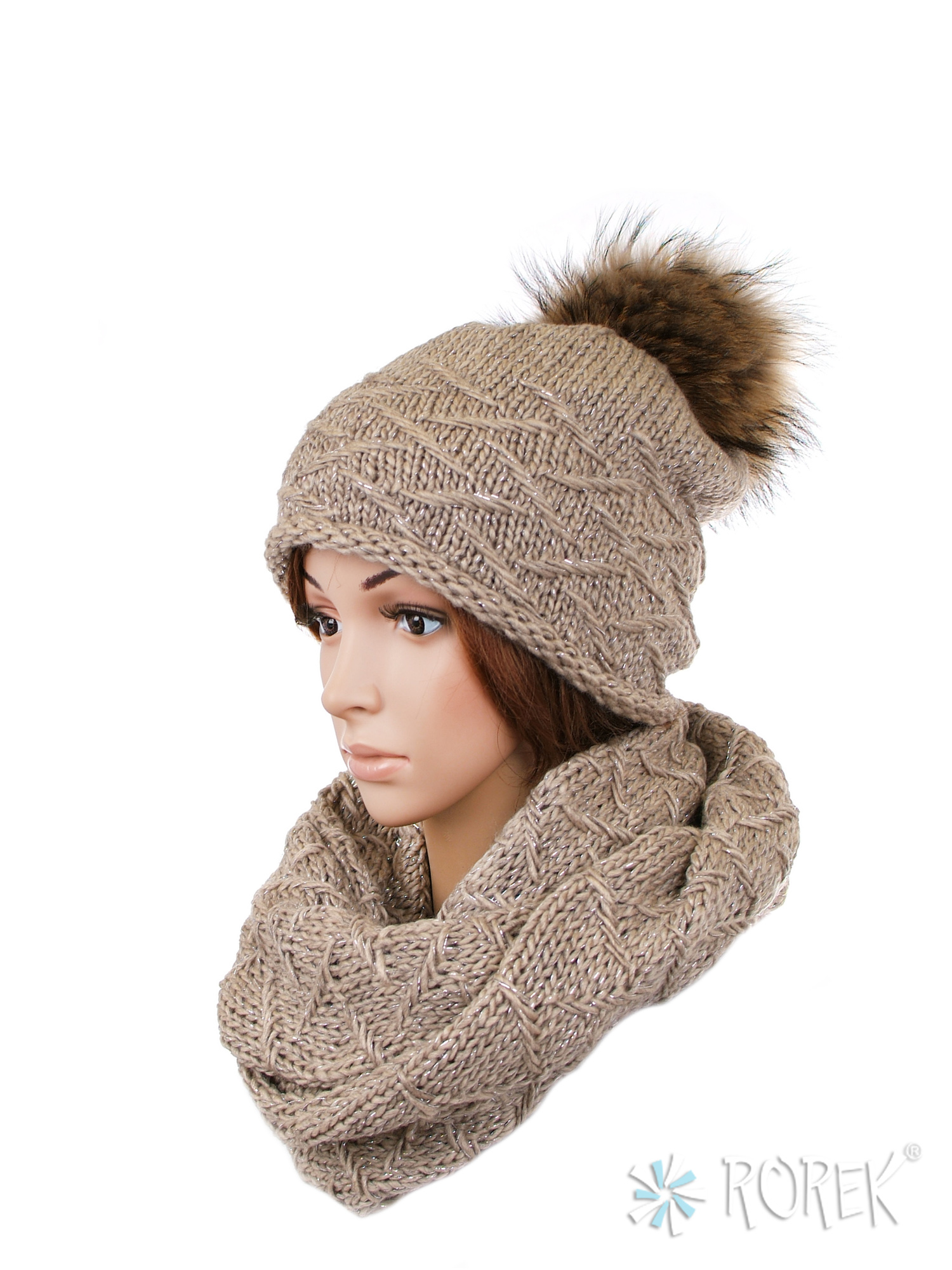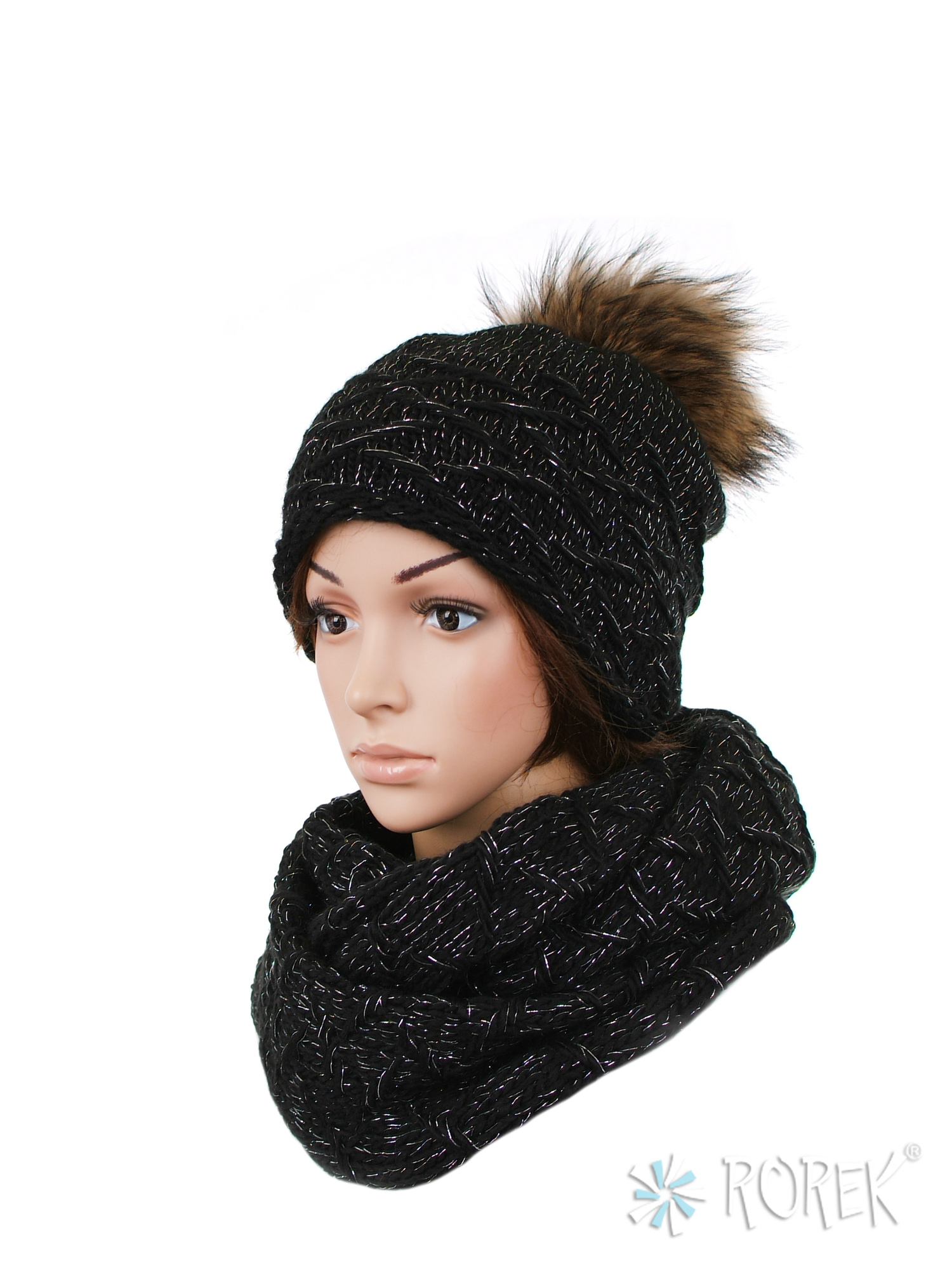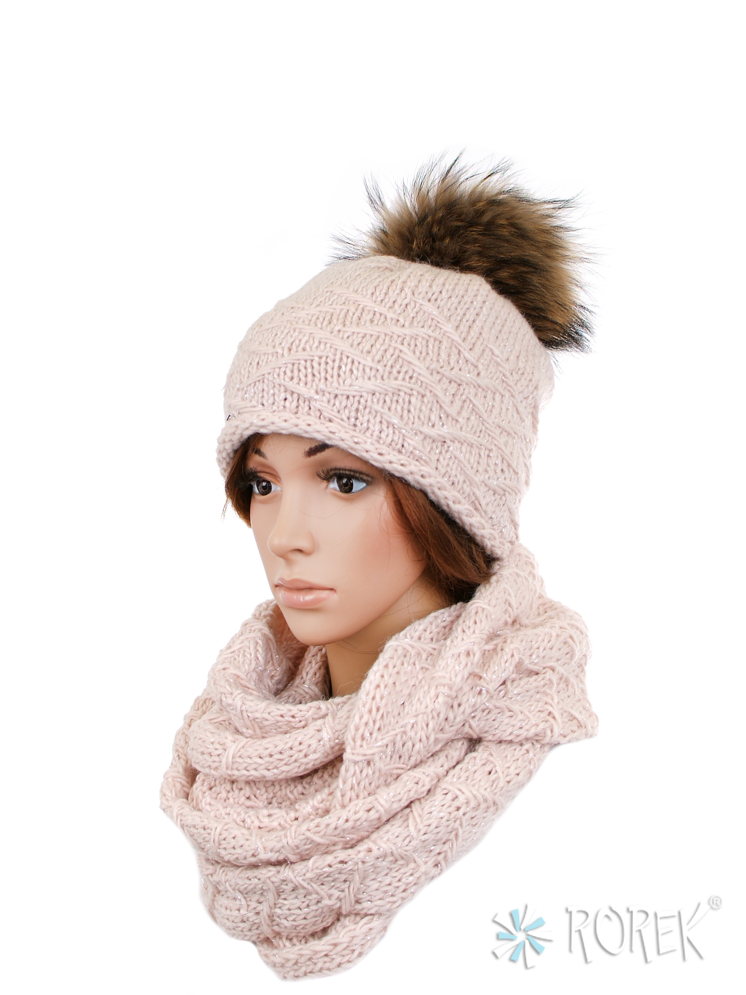 1) Czapka damska o lekkim, klasycznym fasonie zdobiona srebrną nicią. Ciepła, wykonana z pojedynczej warstwy przędzy wzbogaconej wełną i podszyta dodatkowo polarem TERMO. Pompon z naturalnego futra z jenota stanowi ciekawy dodatek.